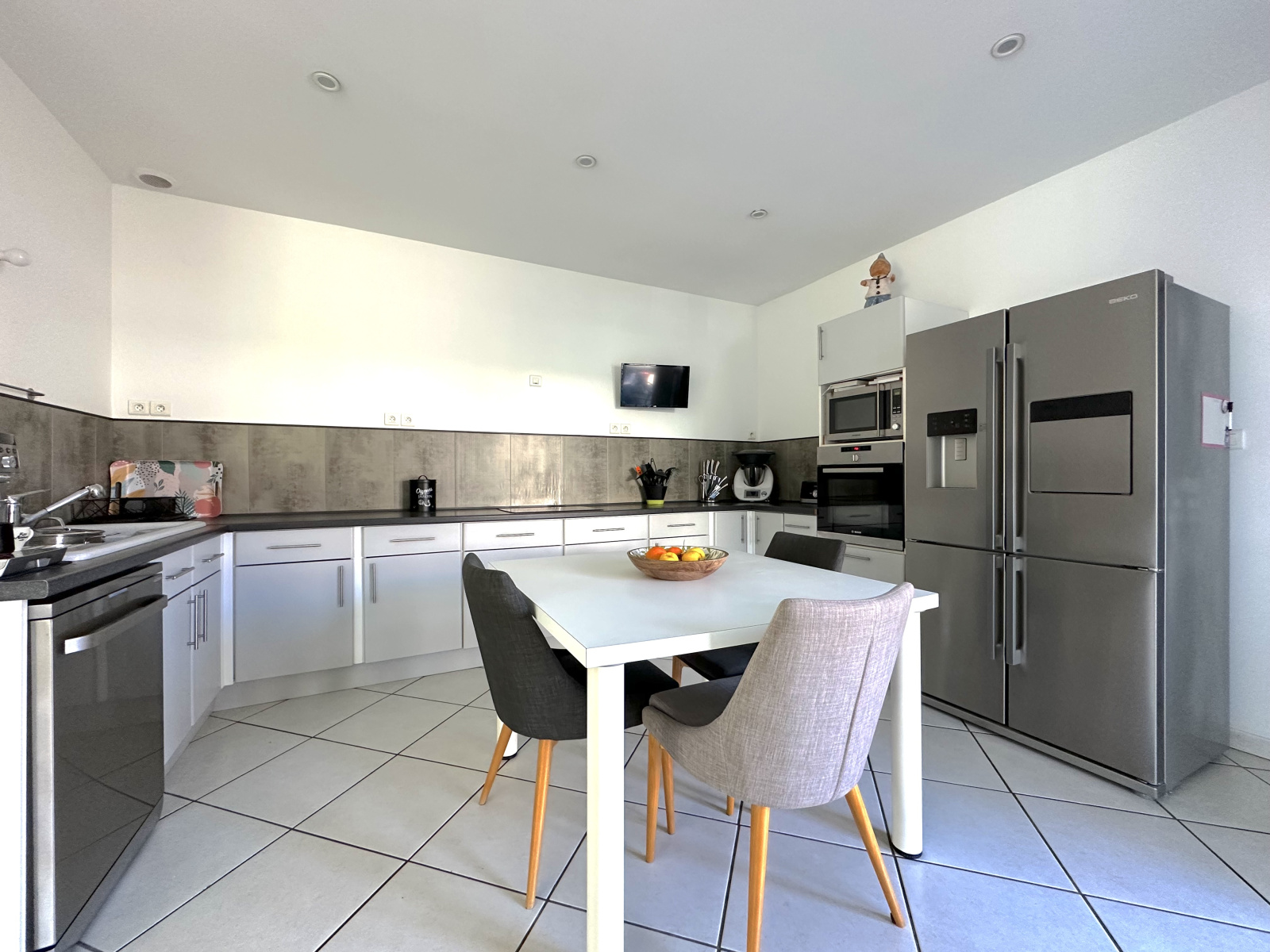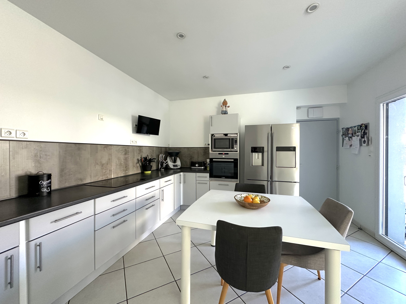 Passé le portail, on découvre une maison soignée, baignée de lumière, dont l’entrée s’ouvre sur une vaste pièce à vivre de près de 59m². L’espace salon-salle à manger se prolonge naturellement vers une cuisine ouverte, idéale pour les moments de convivialité. L’ensemble, spacieux et chaleureux, s’adapte aux envies d’aménagement et de partage.