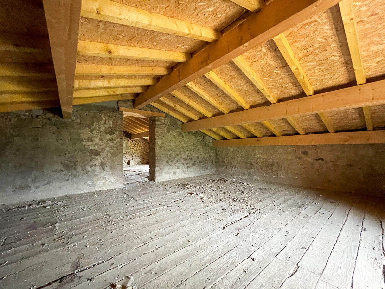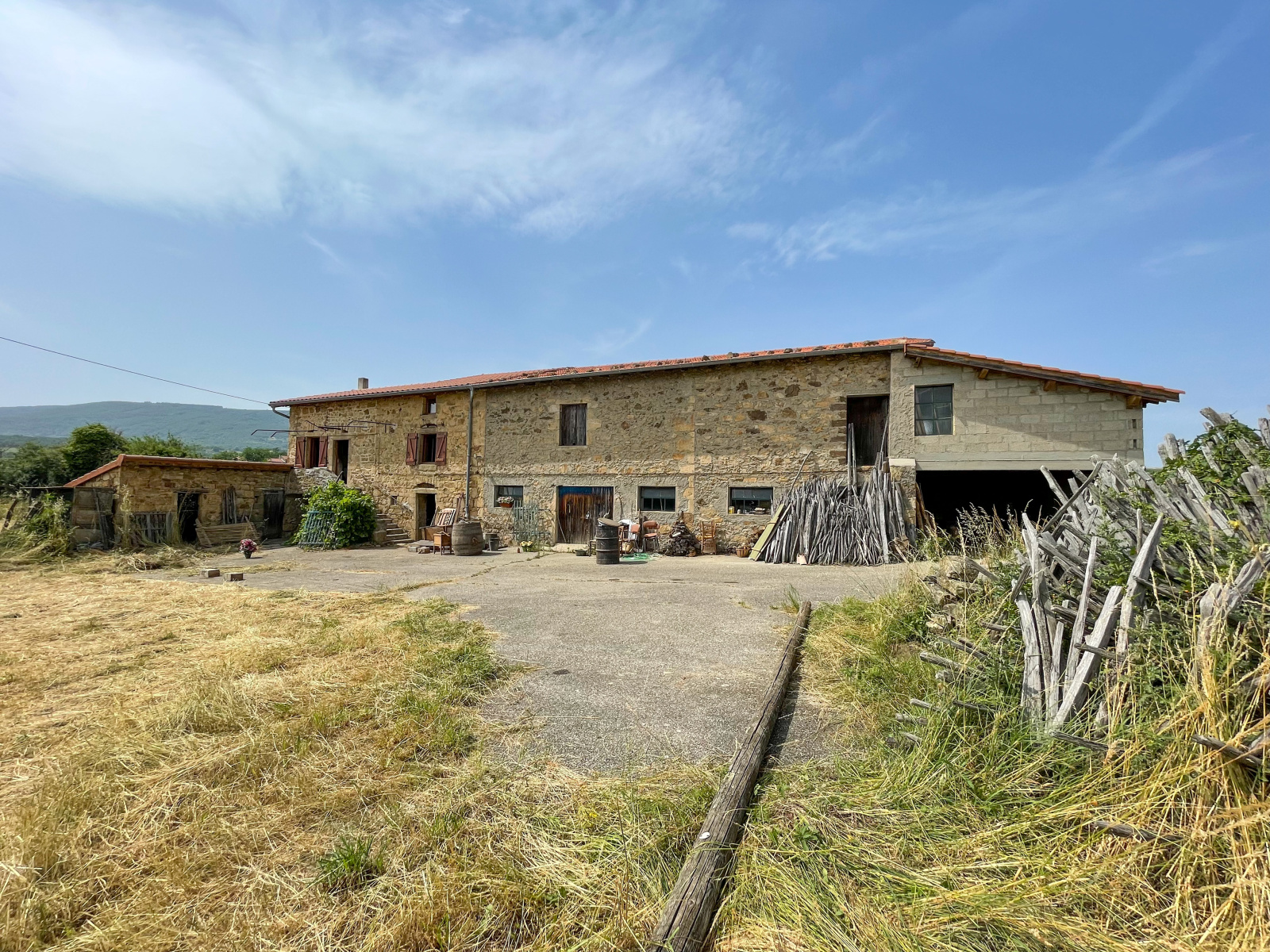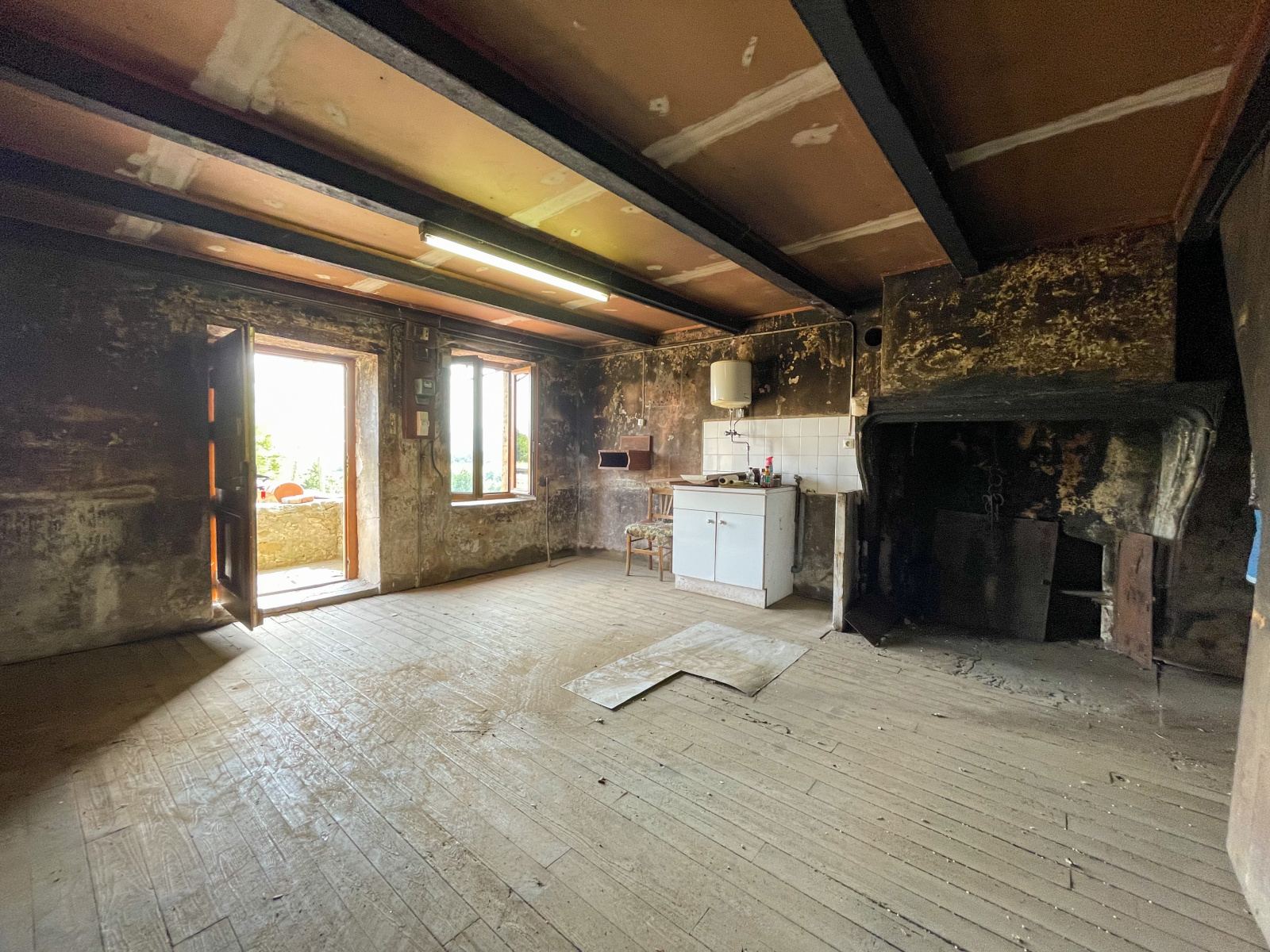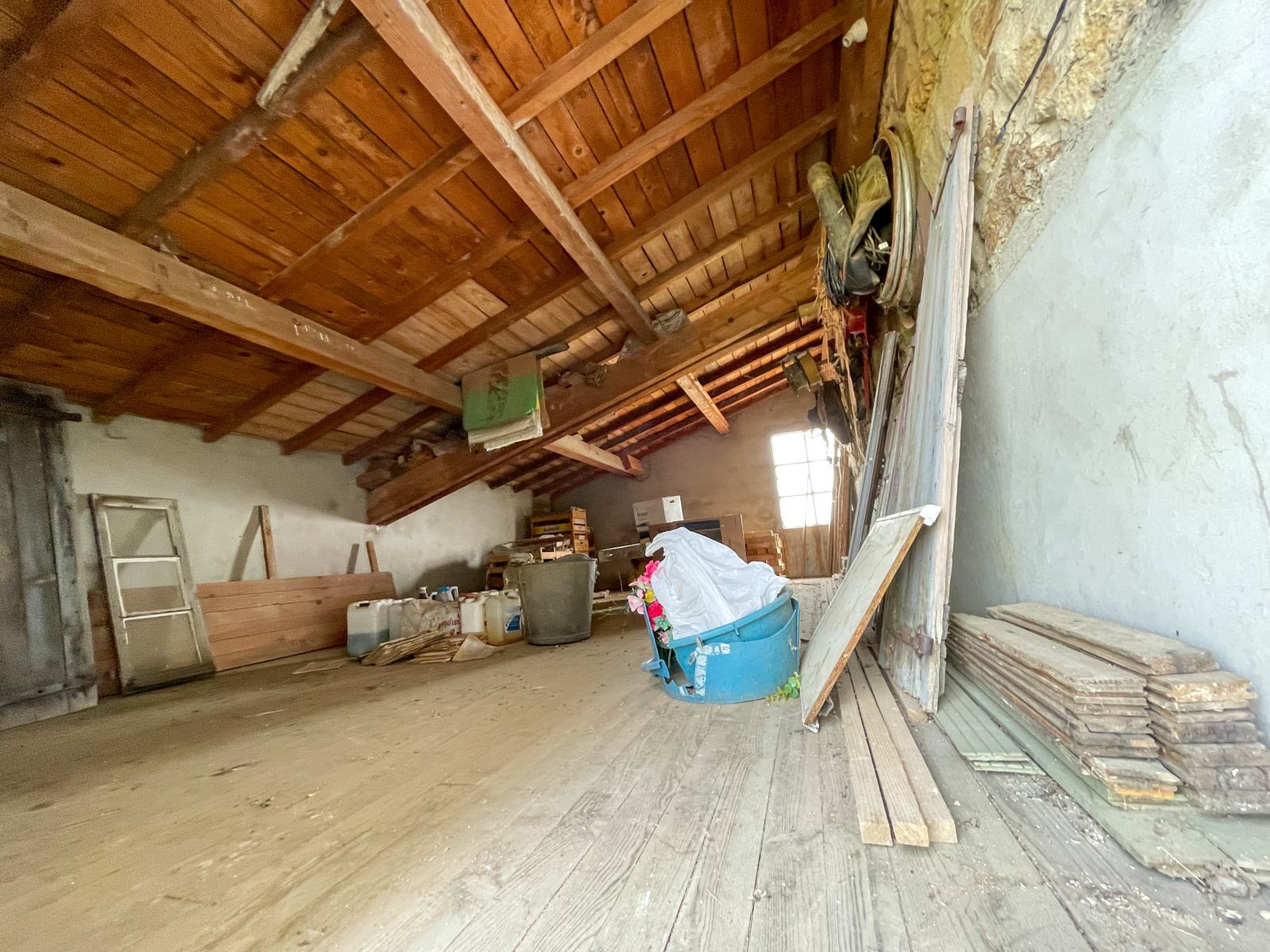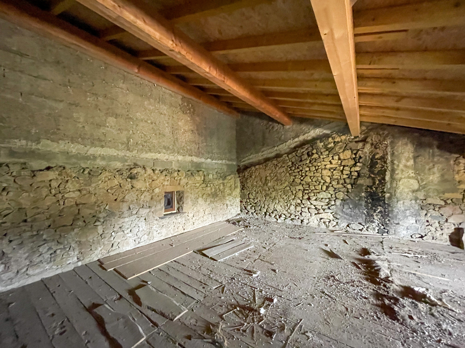 La partie déclarée habitable (mais à rénover totalement), se compose actuellement d'une cuisine de 25,96 m2, d'une chambre de 13,7 m2, d'un bureau de 8,84 m2 et de deux greniers de 26,62 m2 et 24,68 m2. Adjacent à la maison, vous trouverez une première grange de 71 m2, ainsi qu’une seconde grange de 115 m2 au sol, avec une fenêtre condamnée qui donnait autrefois accès à une terrasse de 30 m2 (avec un espace de stockage de la même surface au niveau inférieur).