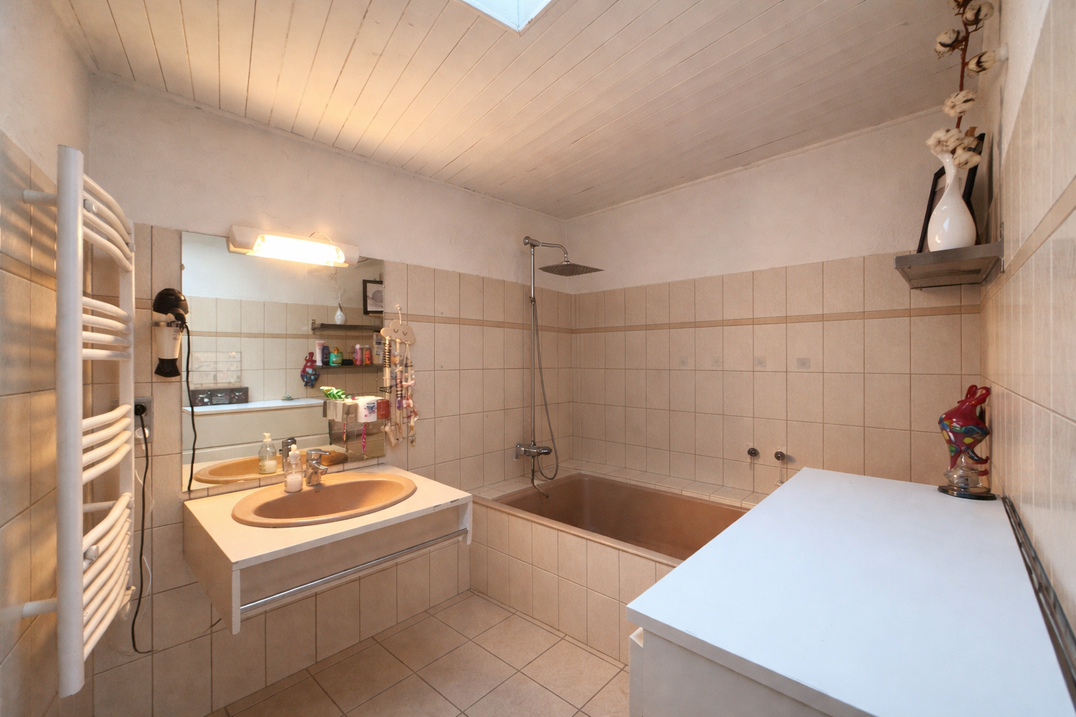 Sèche serviette, une vasque, vélux, radiateur,
