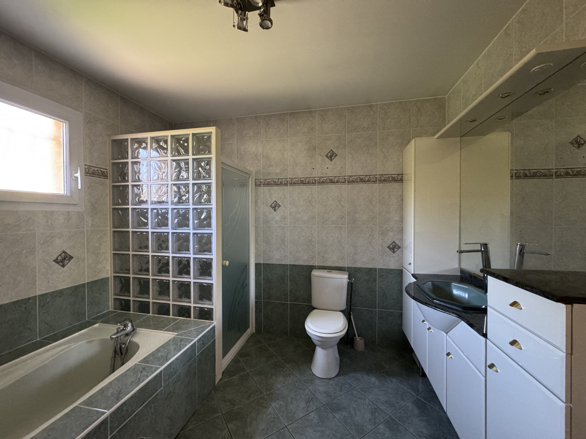 Salle de bain de 9 m² : baignoire, douche, simple vasque, WC, fenêtre et VMC,