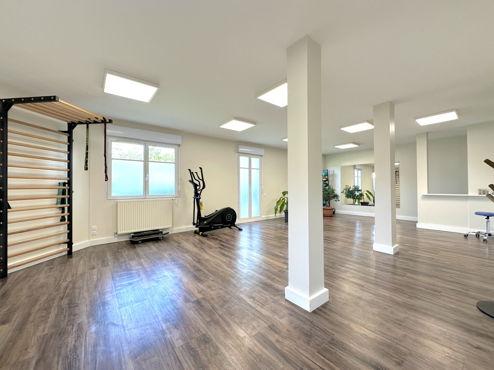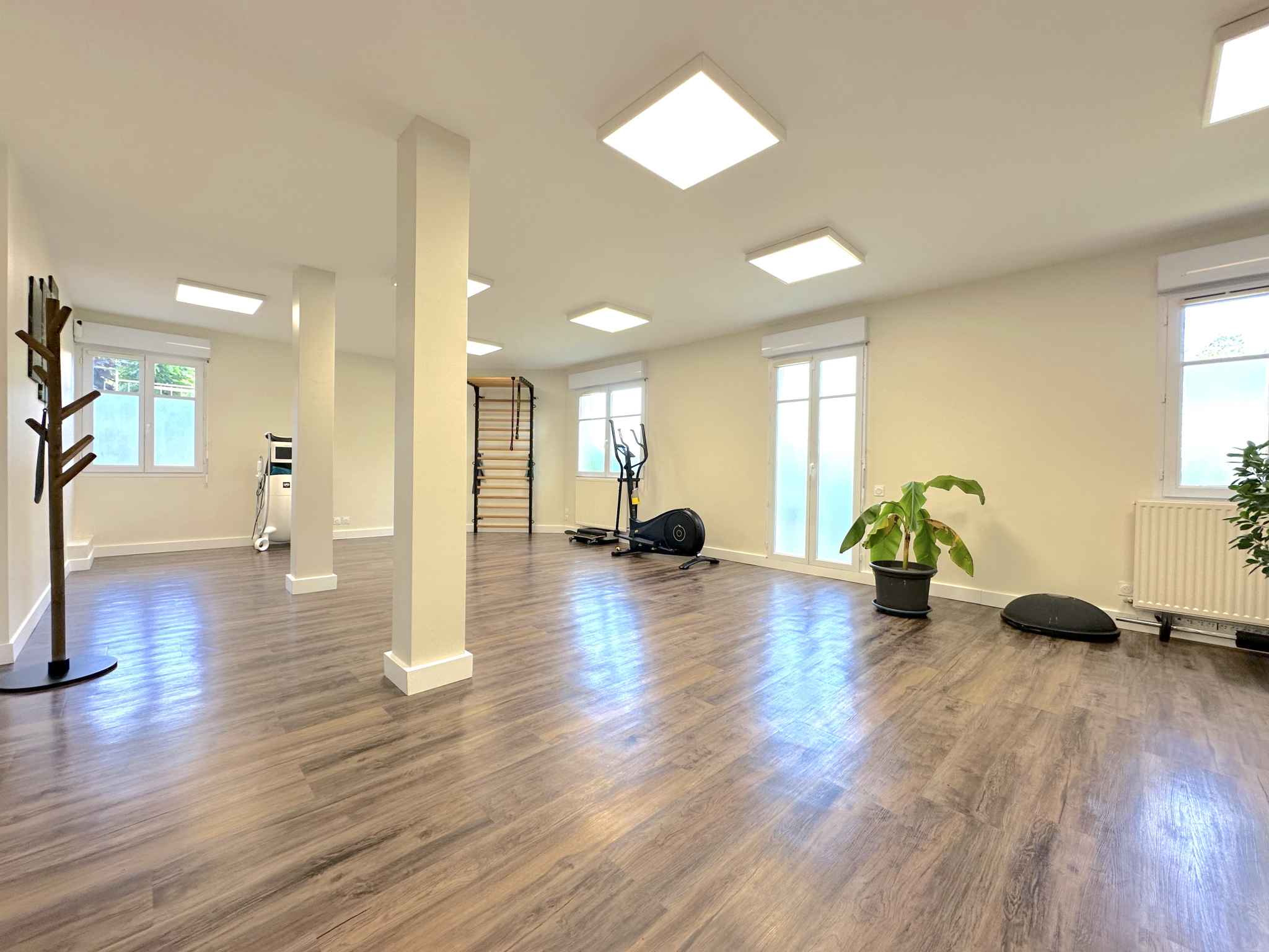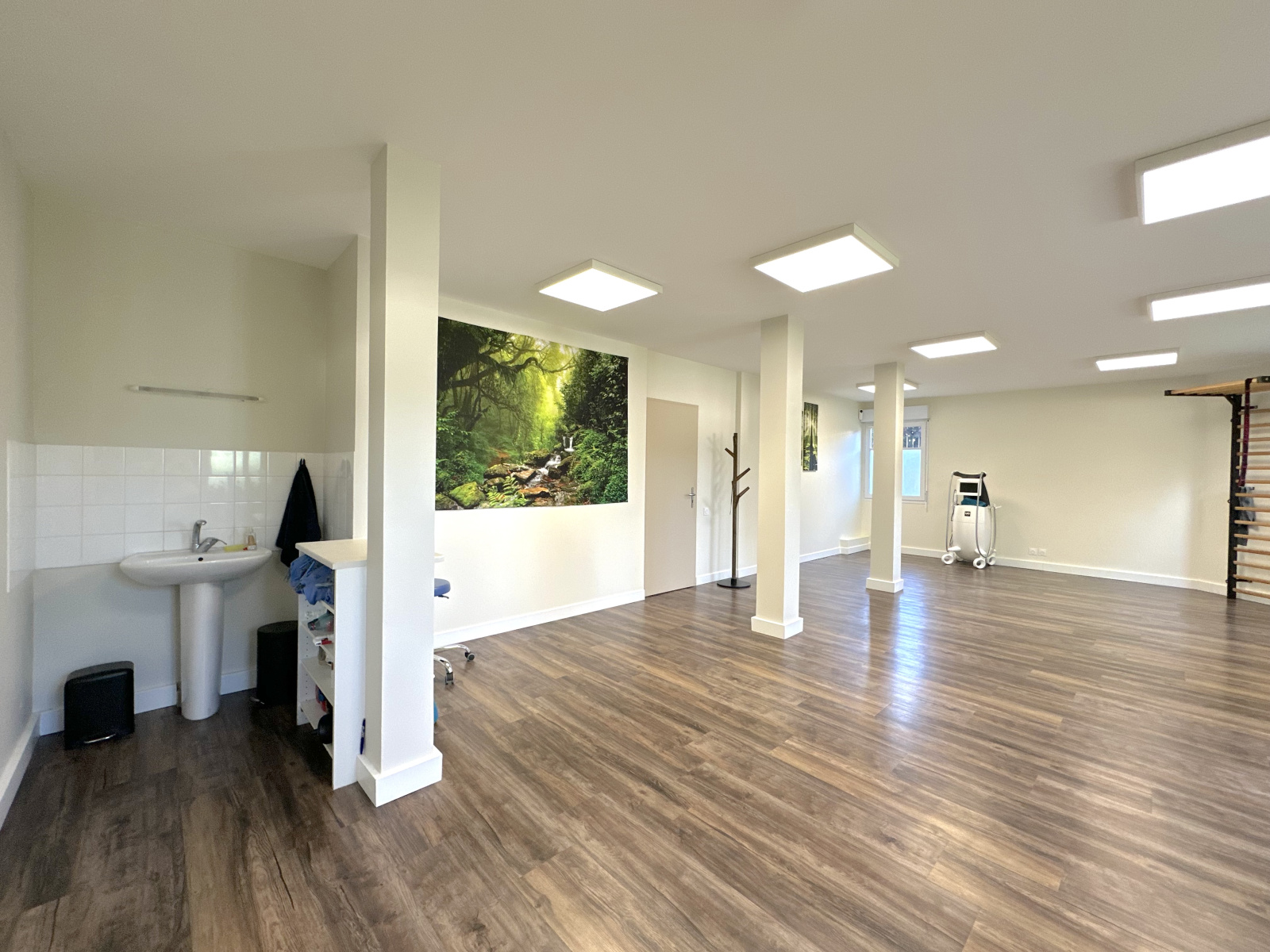 Disposant d'une grande salle polyvalente de 49m2 avec point d'eau et accès à une terrasse privée, de deux pièces avec point d'eau chacune de 8,2 et 9,2m2 pouvant faire office de bureau ou salle de soin, d'un WC pour la clientèle, d'un second WC pour le personnel et d'une salle de pause avec rangement de plus de 10m2. Un vaste dégagement à l'entrée pouvant servir de salle d'attente pour la clientèle / patientèle vient compléter les volumes.