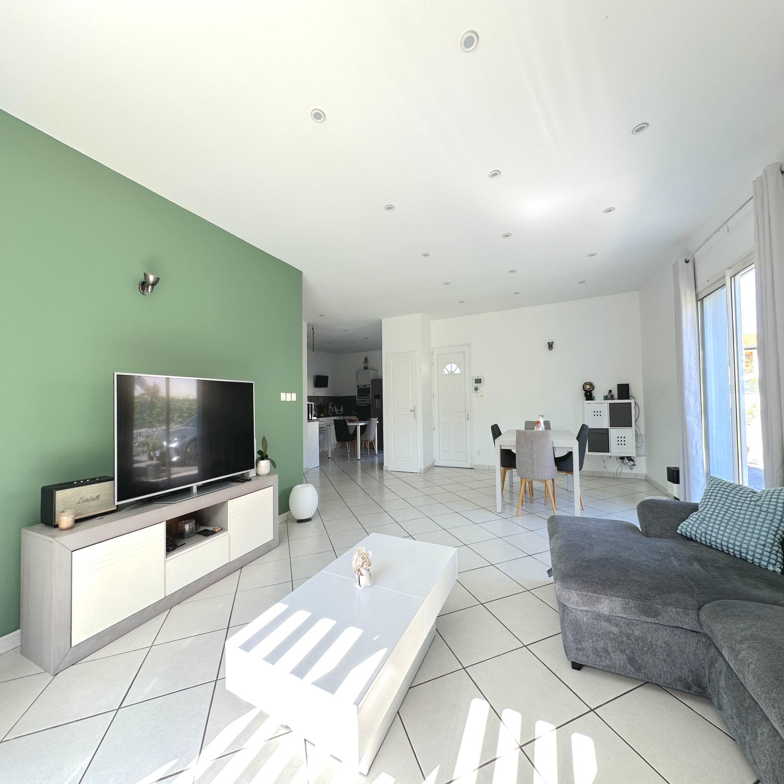 Passé le portail, on découvre une maison soignée, baignée de lumière, dont l’entrée s’ouvre sur une vaste pièce à vivre de près de 59m². L’espace salon-salle à manger se prolonge naturellement vers une cuisine ouverte, idéale pour les moments de convivialité. L’ensemble, spacieux et chaleureux, s’adapte aux envies d’aménagement et de partage.