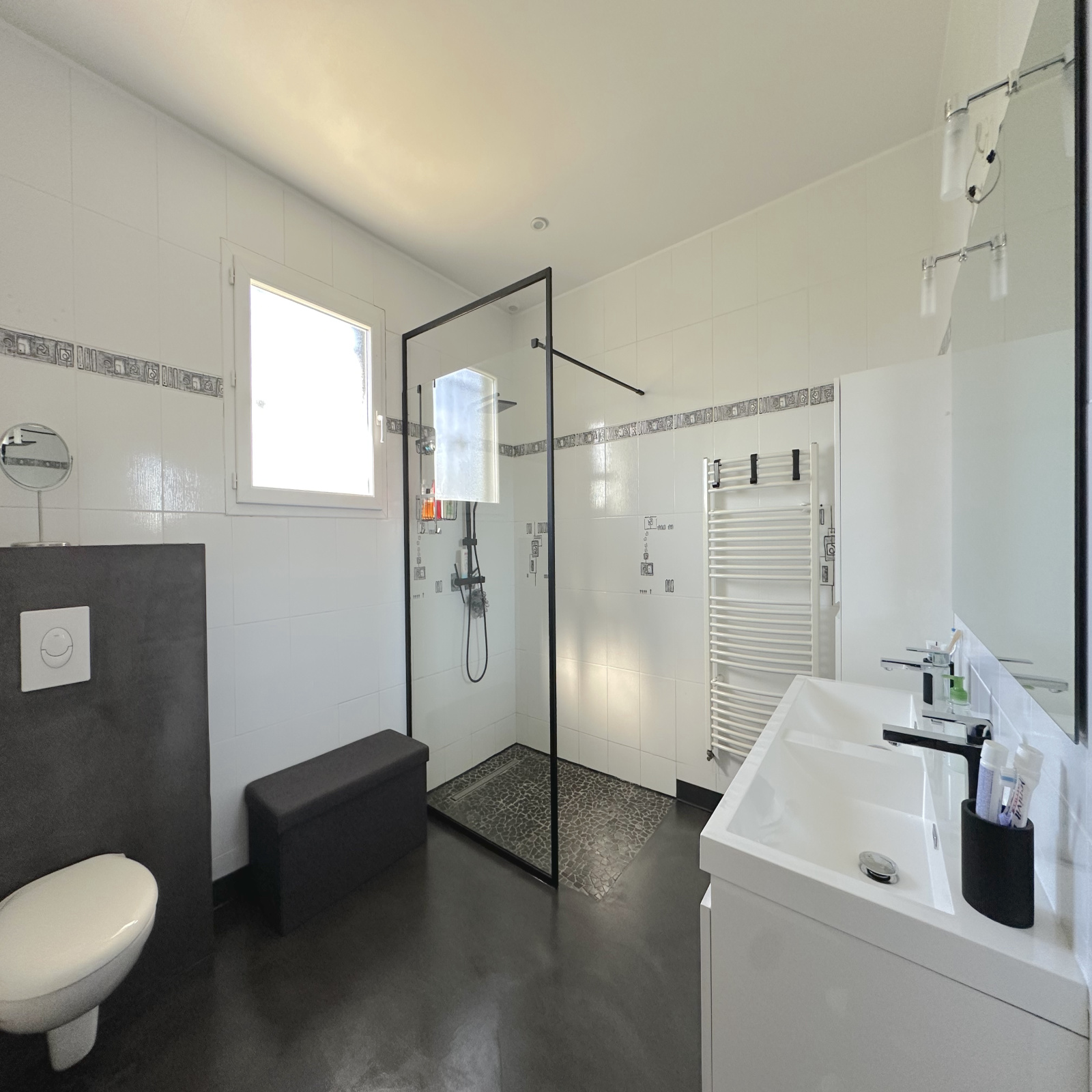 Côté nuit, trois grandes chambres accueillent la famille : deux disposent de rangements intégrés, et chacune offre de beaux volumes (jusqu’à 15,5m²). La salle d’eau, moderne et fonctionnelle, dispose d’une double vasque, d’une douche, d’un WC, et d’un sèche-serviettes. Un second WC indépendant avec lave-mains complète l’agencement.