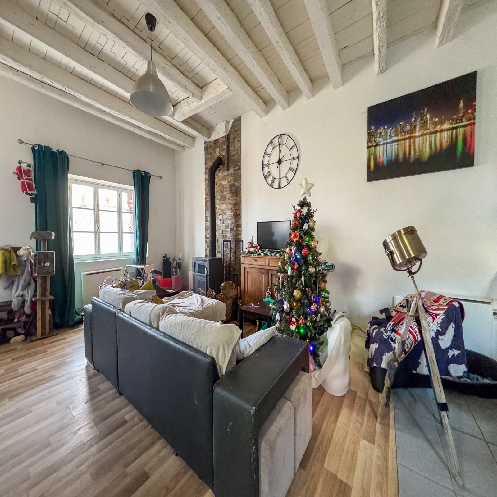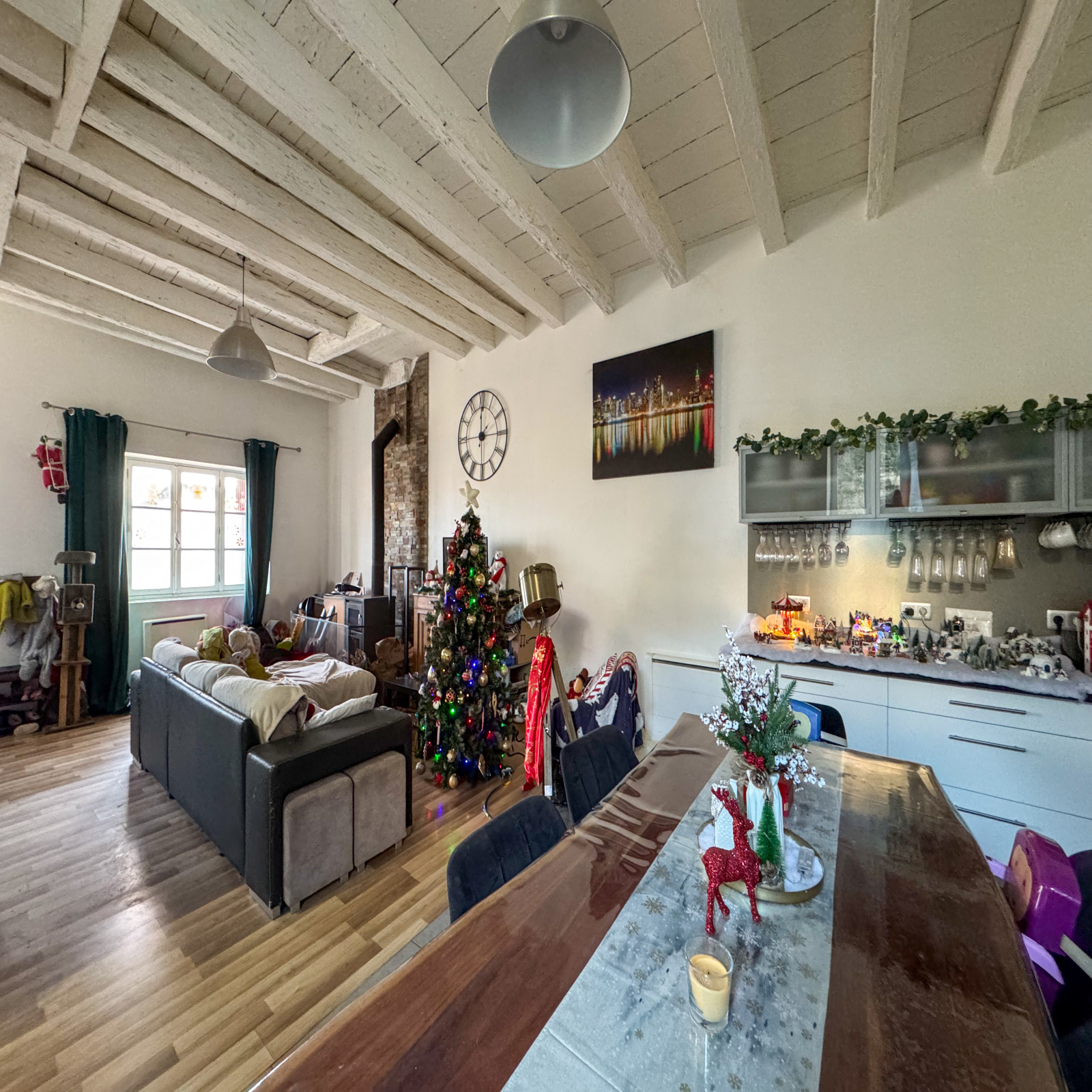 Rénovée partiellement en 2017, ce bien est composé au rez-de-chaussé d'une entrée avec rangements, une cuisine meublée d'environ 24,19m2 ouverte sur un chaleureux salon/séjour de 19,07m2 avec un poêle à bois, un cellier avec un accès sur l'extérieur, une buanderie avec un toilette et une douche.
