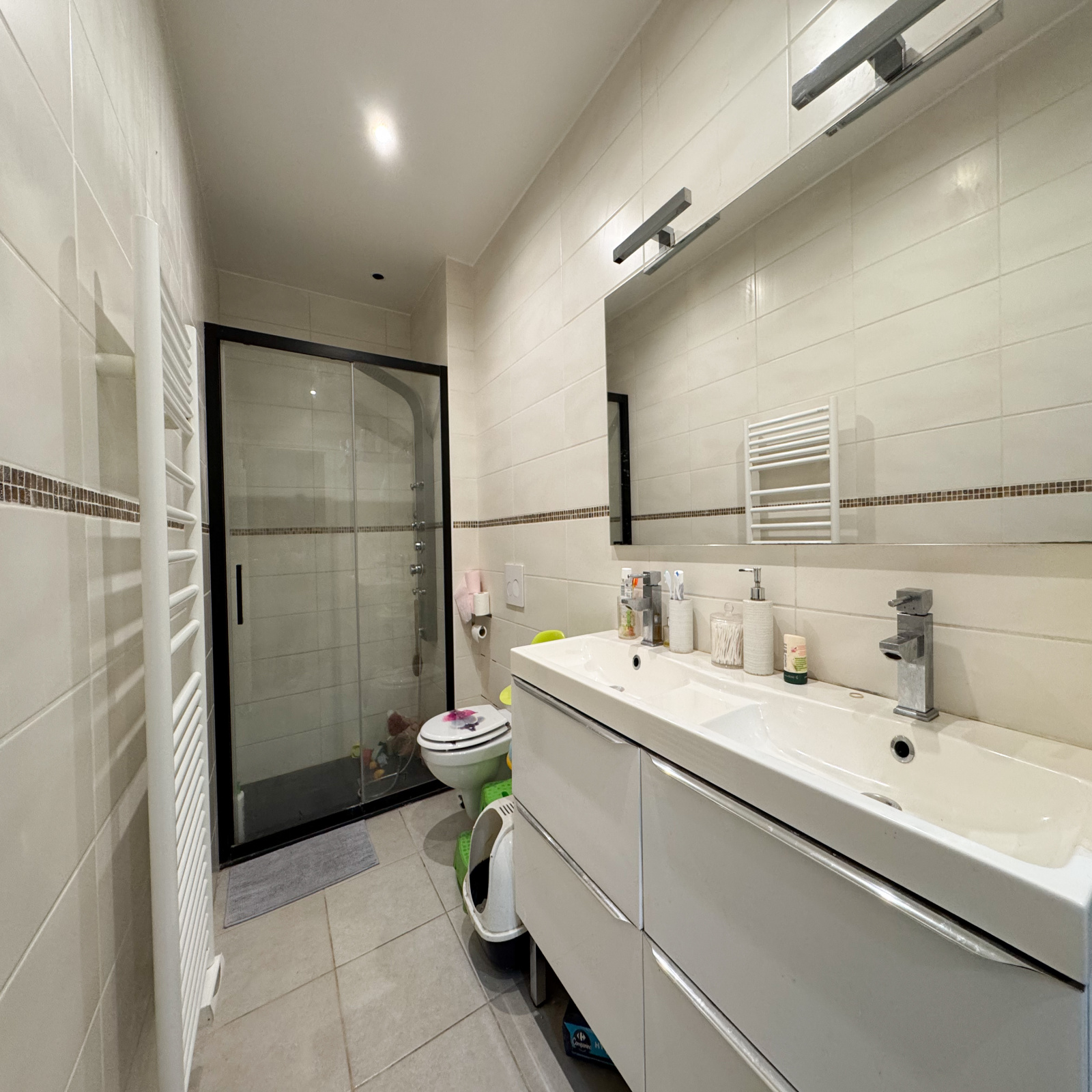 A l'étage vous trouverez un dégagement desservant deux spacieuses chambres avec dressing de 16,8 et 17,98 m2, une salle d'eau (WC suspendu, sèche serviettes, VMC, double vasques)