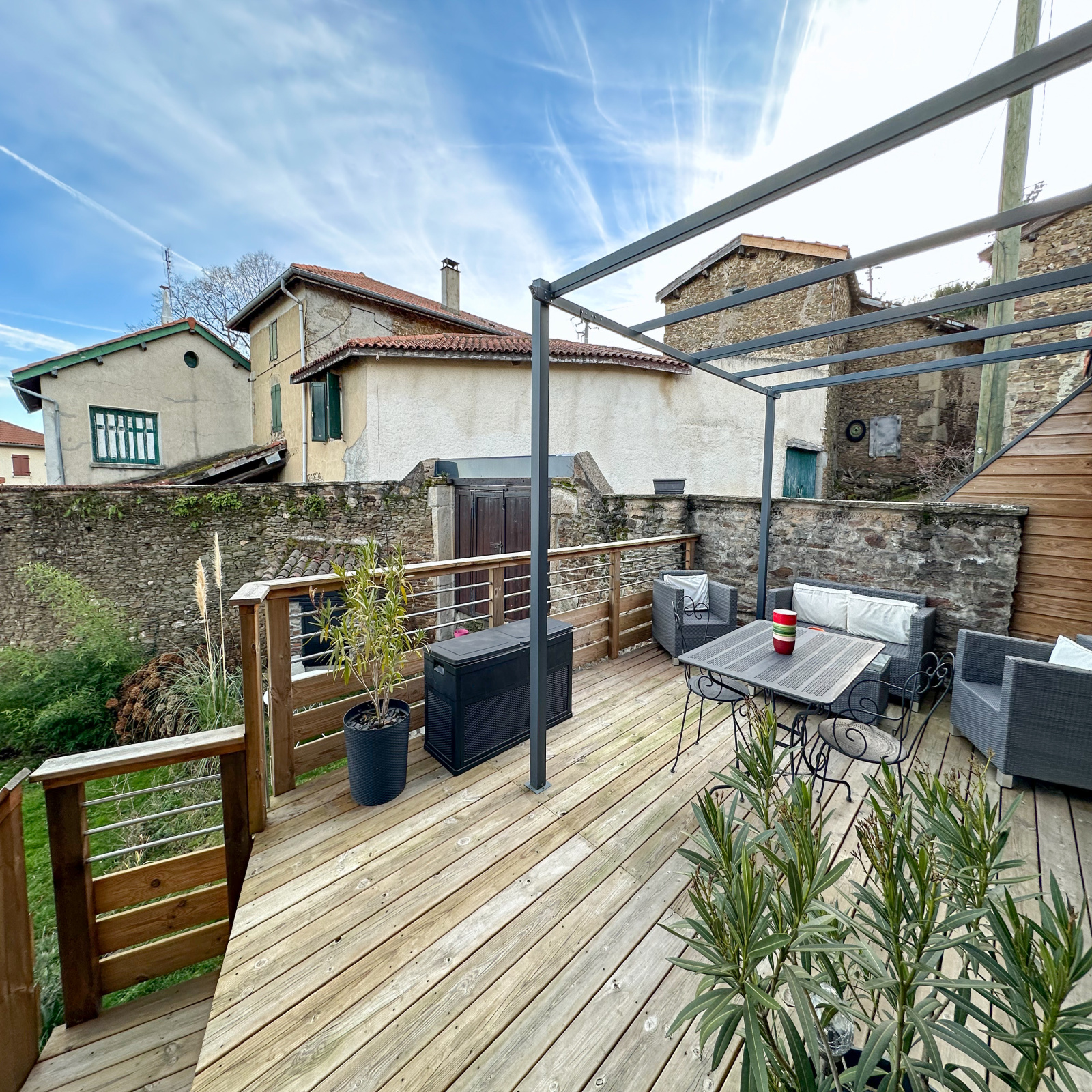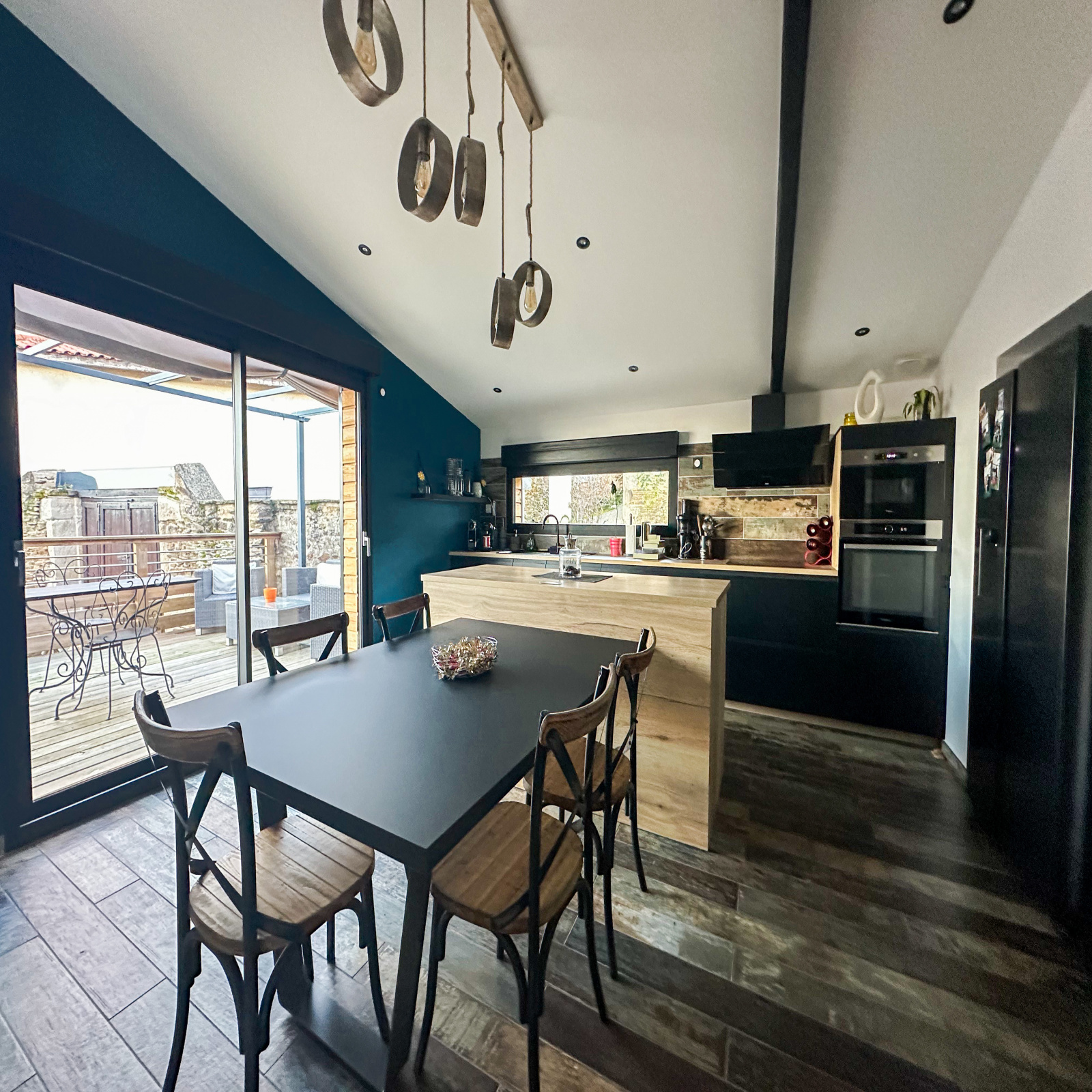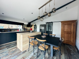 - La cuisine aménagée de 21,36 m2, entièrement équipée, offre un lieu convivial pour préparer et partager des repas. Elle s'ouvre sur une spacieuse terrasse de 22m2 en bois avec une pergola, parfaite pour les moments de détente.