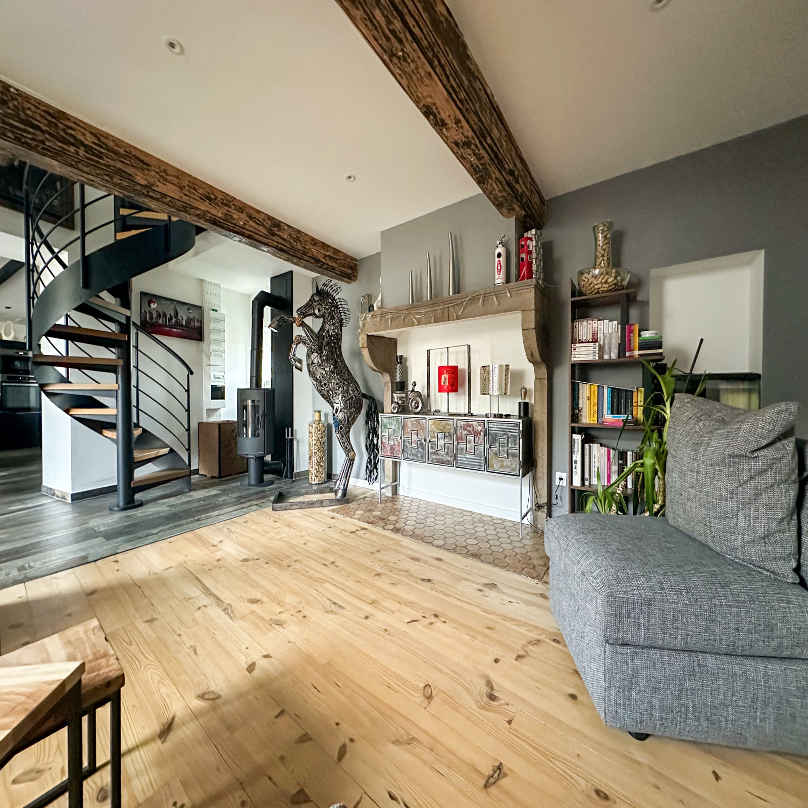 - Le salon-séjour, agrémenté d'un poêle et d'une cheminée d'ornement, crée une atmosphère cosy.
