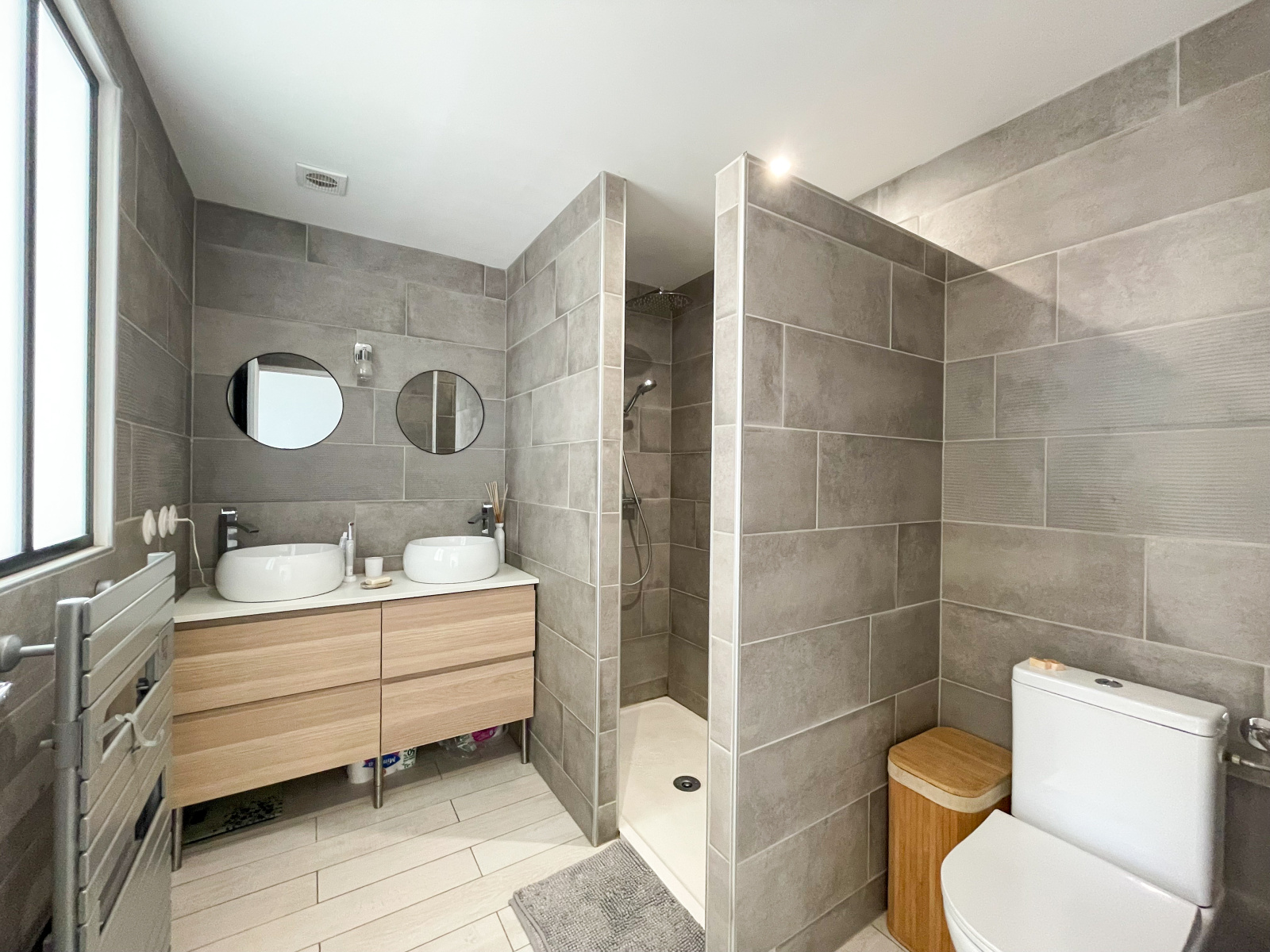 A l’étage un dégagement desservant une chambre ouverte de 15,70m2 avec rangements intégrés et une spacieuse salle d’eau de 5,67m2 avec douche, sèche serviette, une vasque et toilettes.