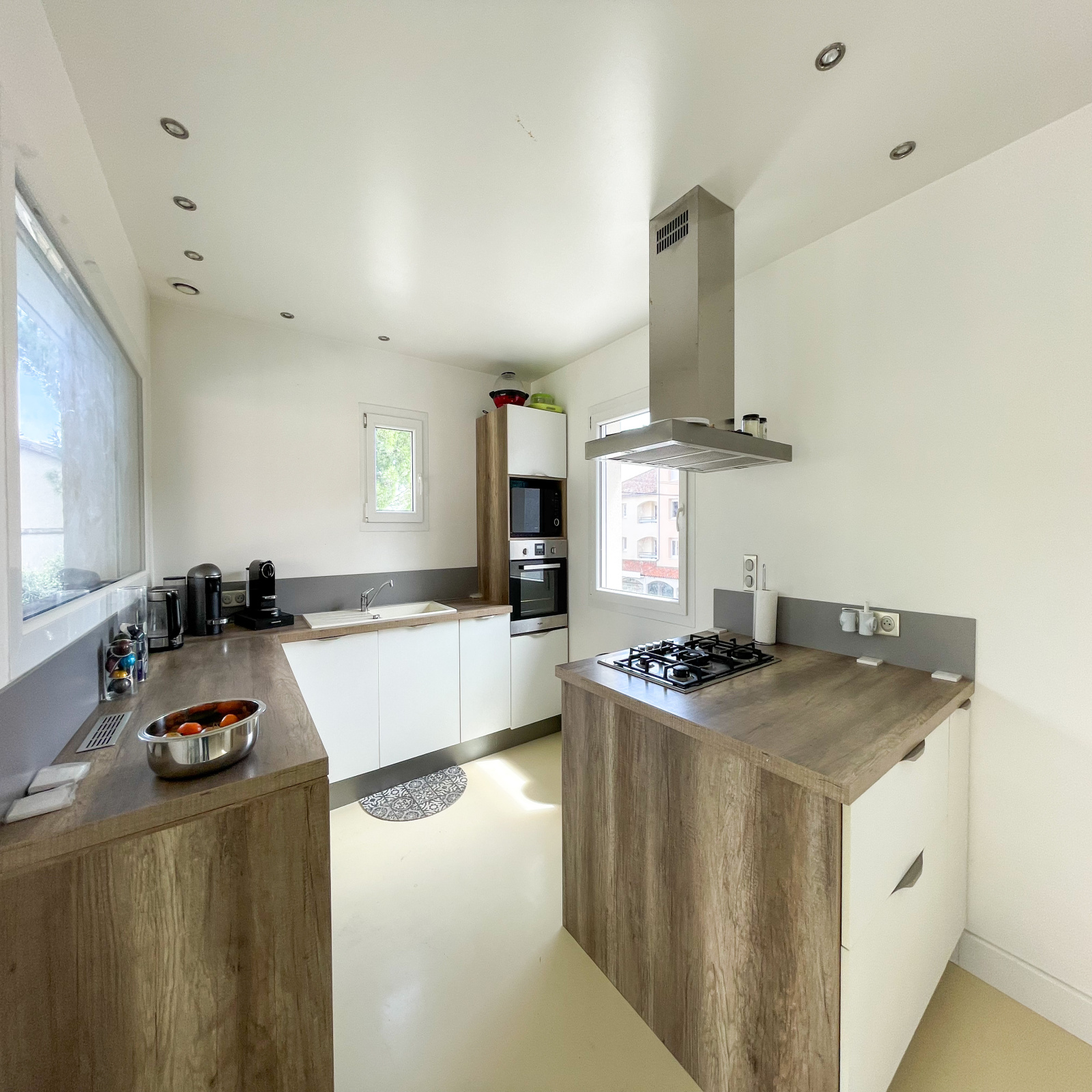 Les menuiseries sont en double vitrage PVC avec des volets roulants électriques centralisés. Le chauffage est assuré par des climatisations réversibles et une chaudière électrique avec chauffage au sol.