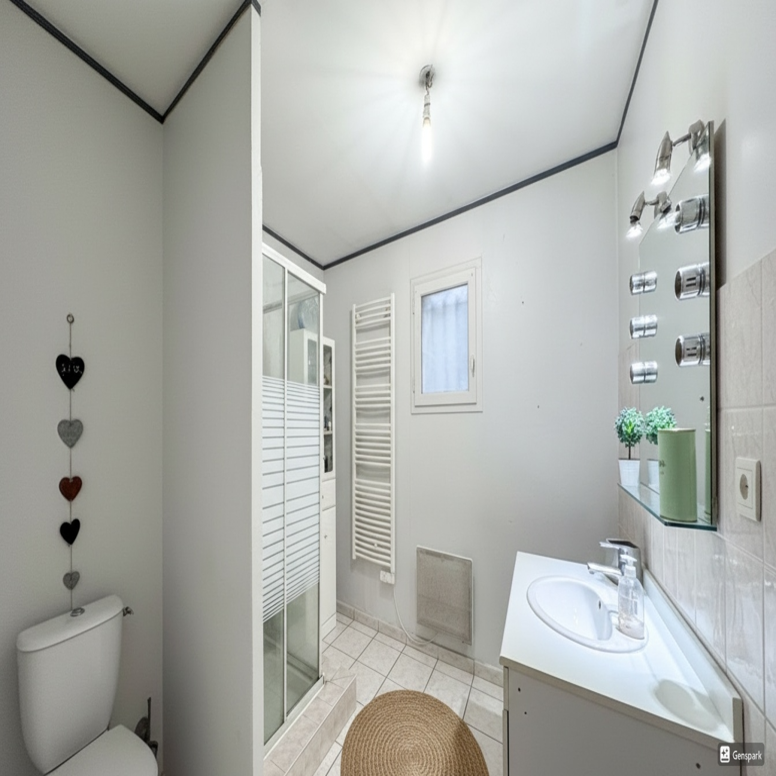 Salle d’eau avec WC (7,54 m²) équipée d’une fenêtre, d’un sèche-serviettes et d’une vasque