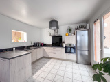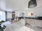 Cuisine ouverte équipée (hotte, plaque gaz, lave-vaisselle, four) refaite en 2015, donnant sur un salon/séjour lumineux de 40,54 m² (conduit pour poêle existant)