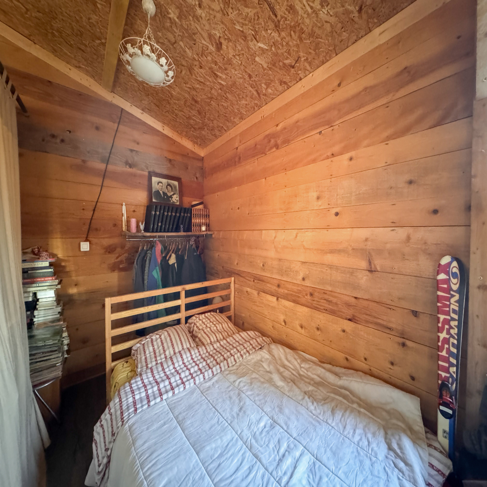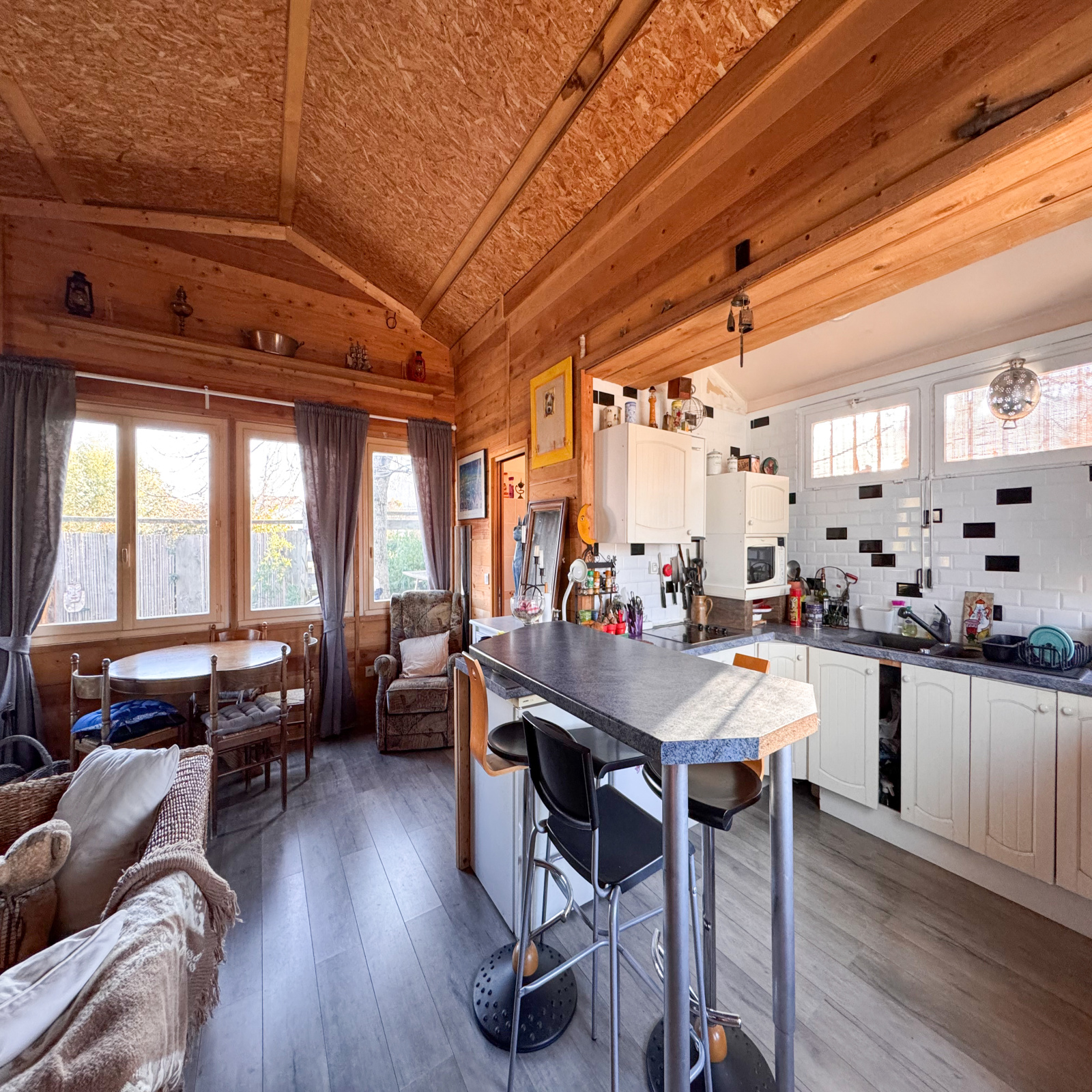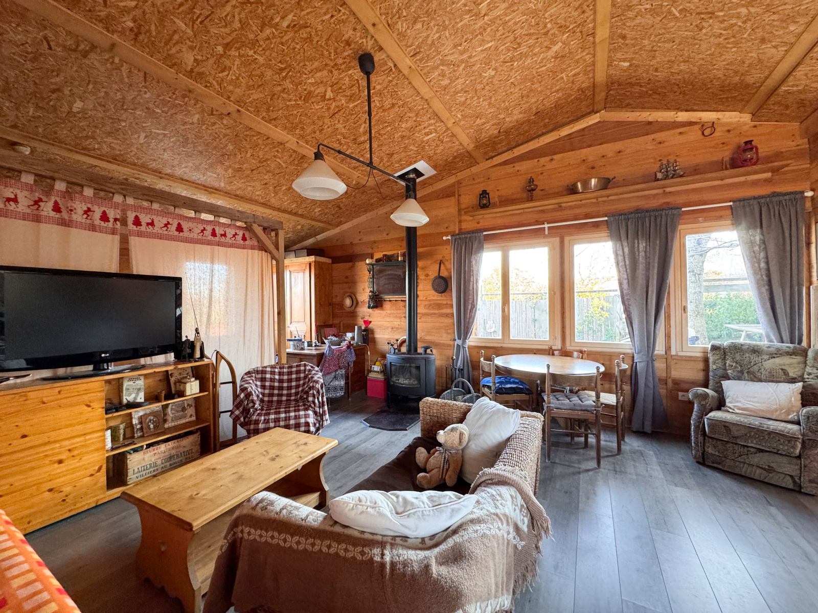 À l’extérieur, vous profiterez d’une belle terrasse en bois de 21,6 m², idéale pour savourer les journées ensoleillées tout en restant à l’ombre.