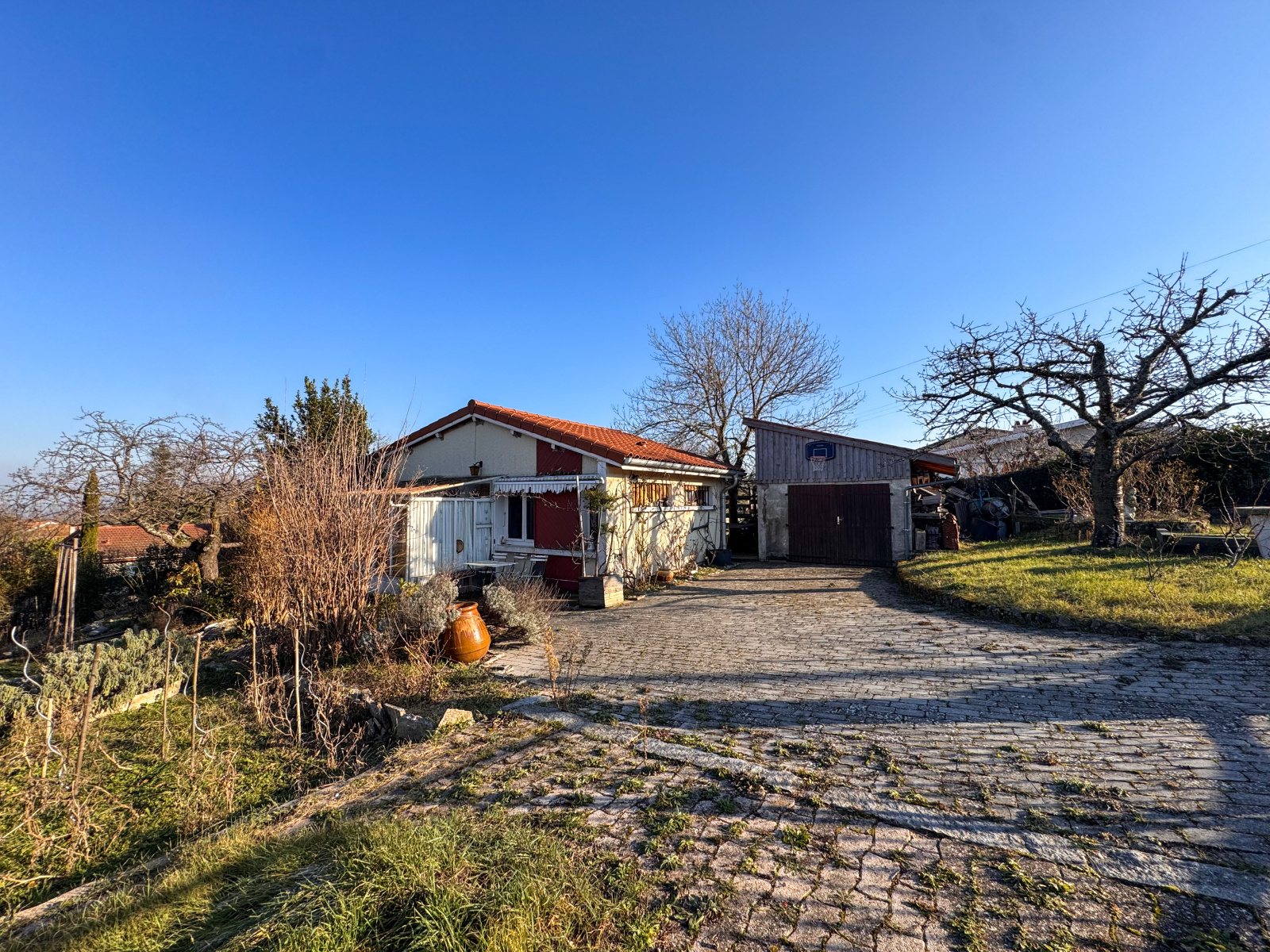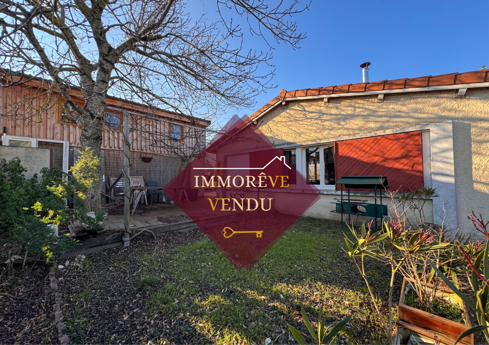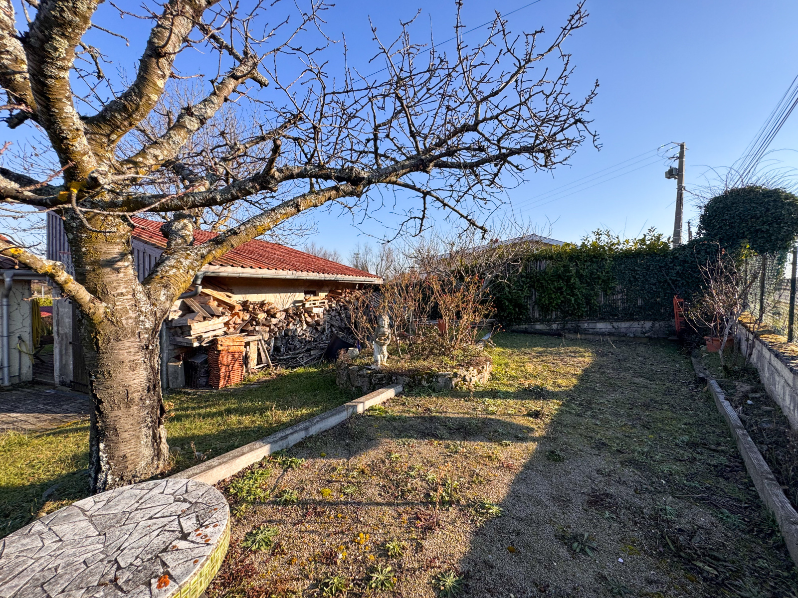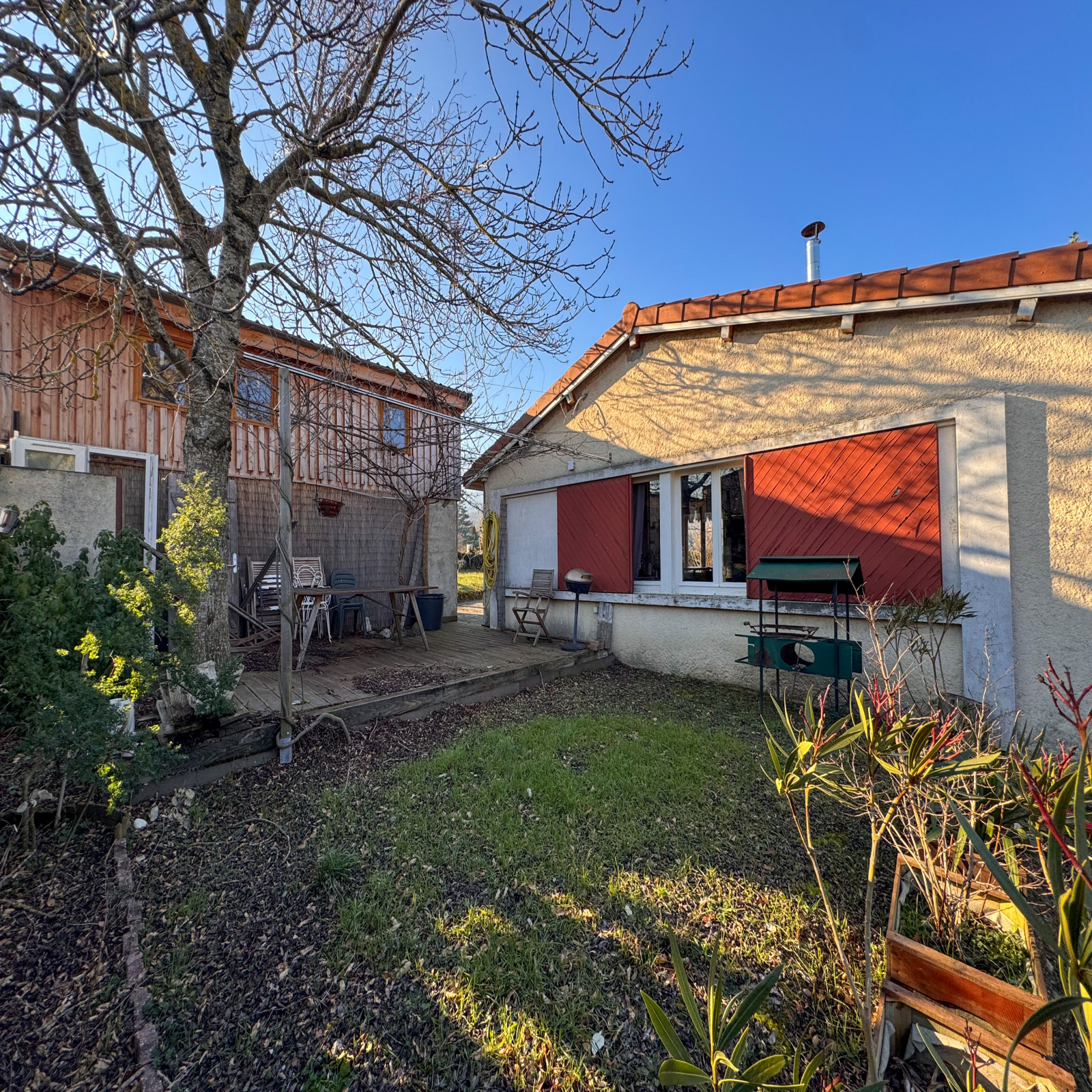Le tout repose sur une parcelle arborée et clôturée de 573 m², agrémentée d’arbres fruitiers, de plantes ornementales et d’un coin potager. Au printemps, cet espace extérieur devient un véritable havre de verdure. Pour les amateurs de détente et de convivialité, un terrain de pétanque et un abri à bois sont également présents.