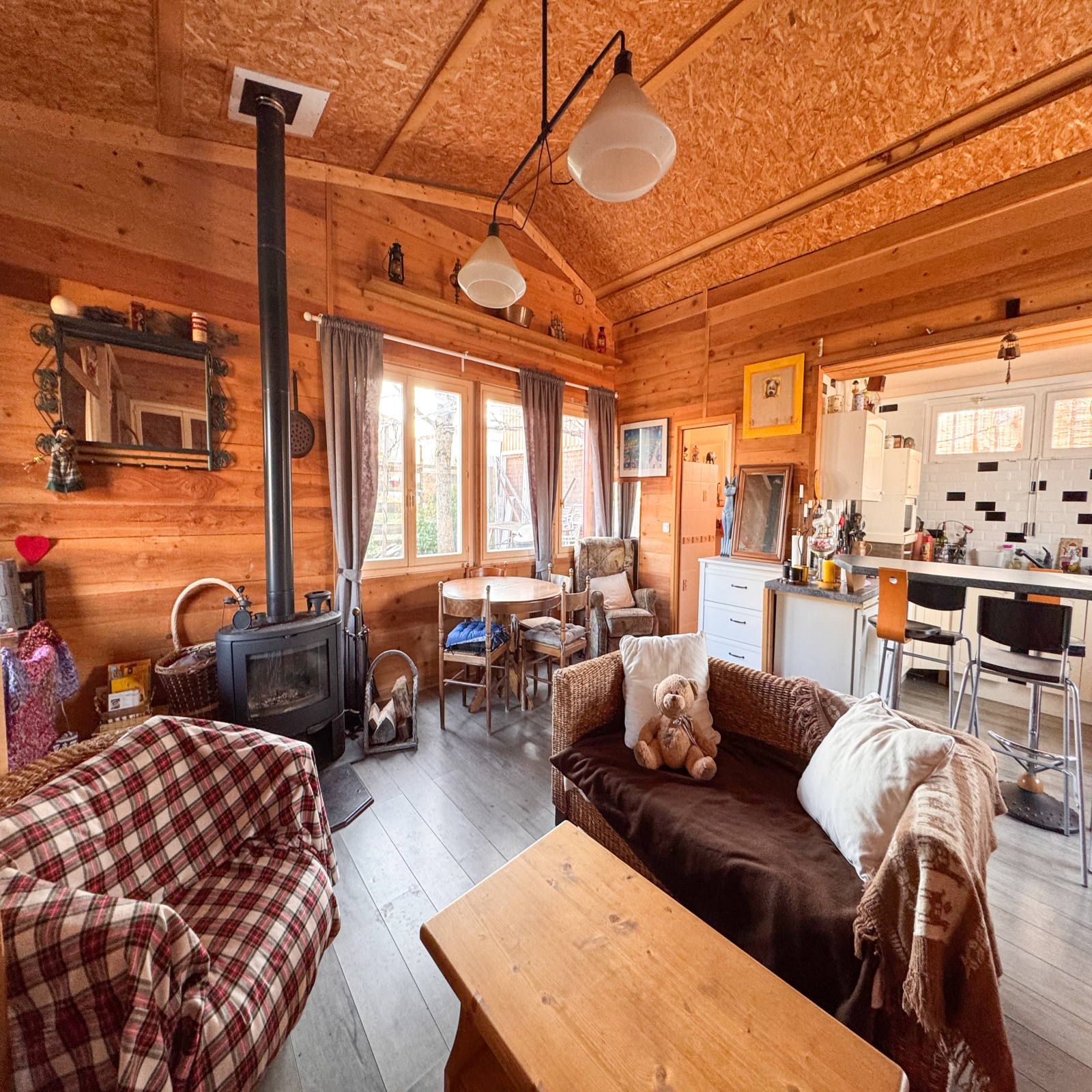 Dès l’entrée, une véranda de 4,8 m² vous accueille, offrant un espace lumineux avant d’accéder à la pièce de vie principale. L’intérieur dévoile une chaleureuse cuisine ouverte sur un salon-séjour agrémenté d’un poêle à bois, le tout sur près de 37,9 m². L’espace nuit, en alcôve ouverte sur le séjour, offre une superficie de 6,8 m². Une salle d’eau fonctionnelle de 4,09 m² complète l’ensemble avec douche, WC et cumulus.