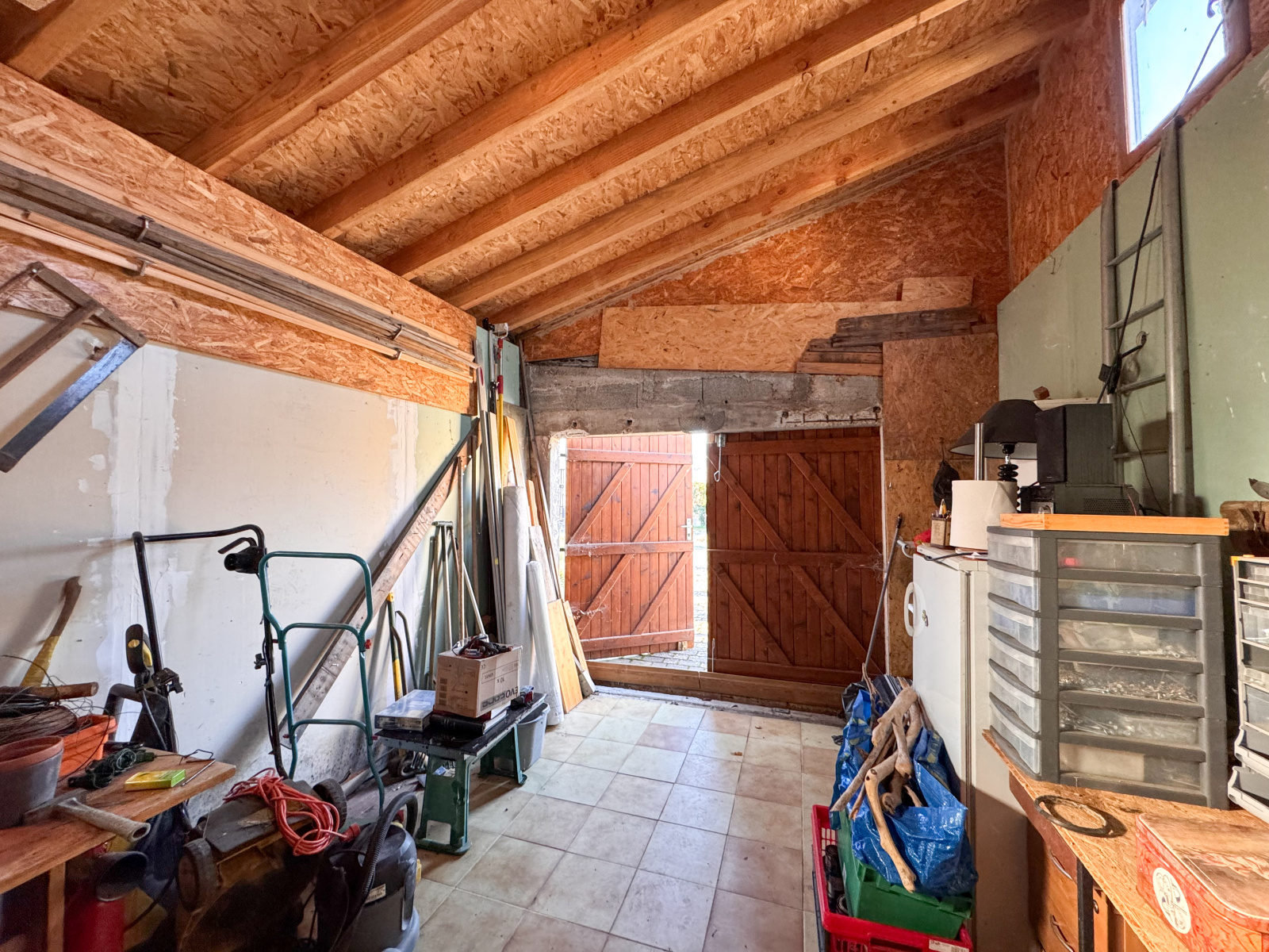 Un garage non attenant de 19,6 m² avec mezzanine de 9,2 m² offre un espace de stockage pratique ou la possibilité d’aménager un atelier ou un studio. Une petite cave de 2 m² accessible depuis l’extérieur complète ces annexes.
