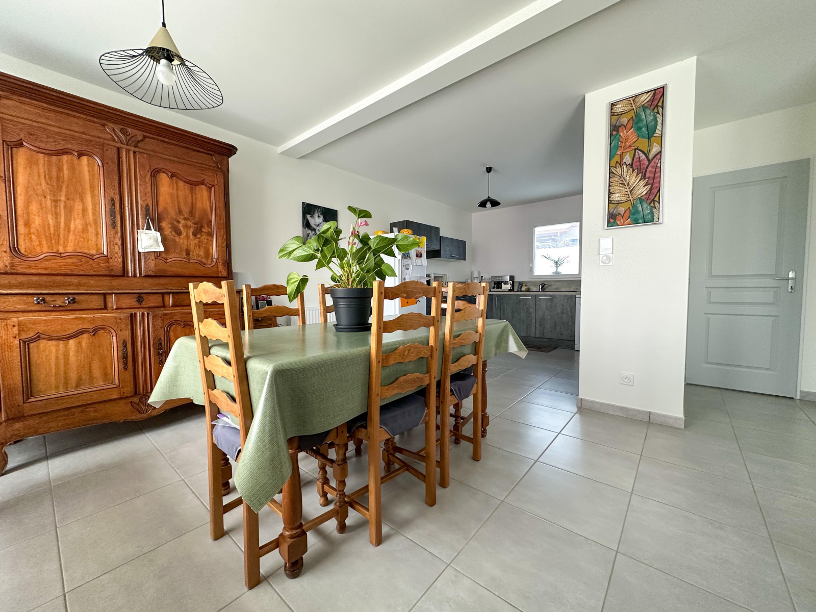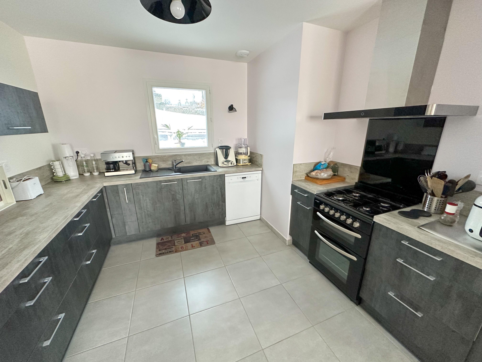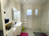 Villa mitoyenne édifiée en 2021 d’environ 87,7 m2 habitables, comprennant au rez-de-chaussée un hall d’entrée avec rangements, en demi-niveau inférieur une belle cuisine meublée équipée ouverte sur salon séjour de presque 40 m2, donnant accès à la terrasse et au jardin, une buanderie et un wc séparé avec lave mains (VMC).