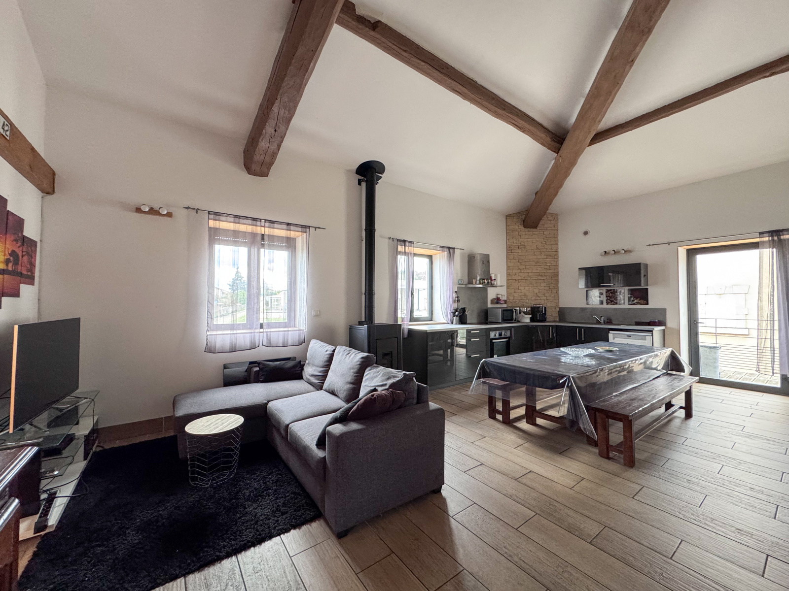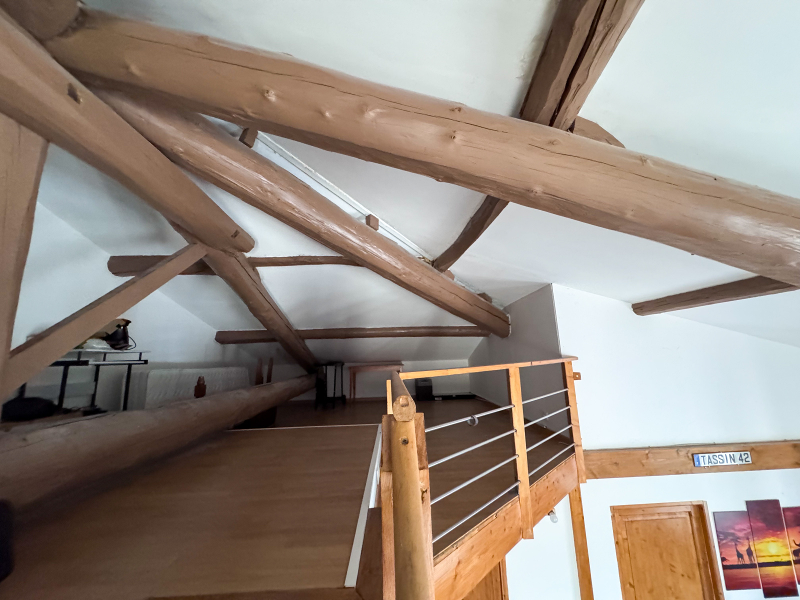 À l'étage, les combles aménagées de 32 m² au sol, avec charpente apparente, offrent un espace idéal pour un bureau ou une chambre d'appoint. Le secteur calme et le stationnement communal au pied de l'immeuble apportent un vrai plus à ce bien.
