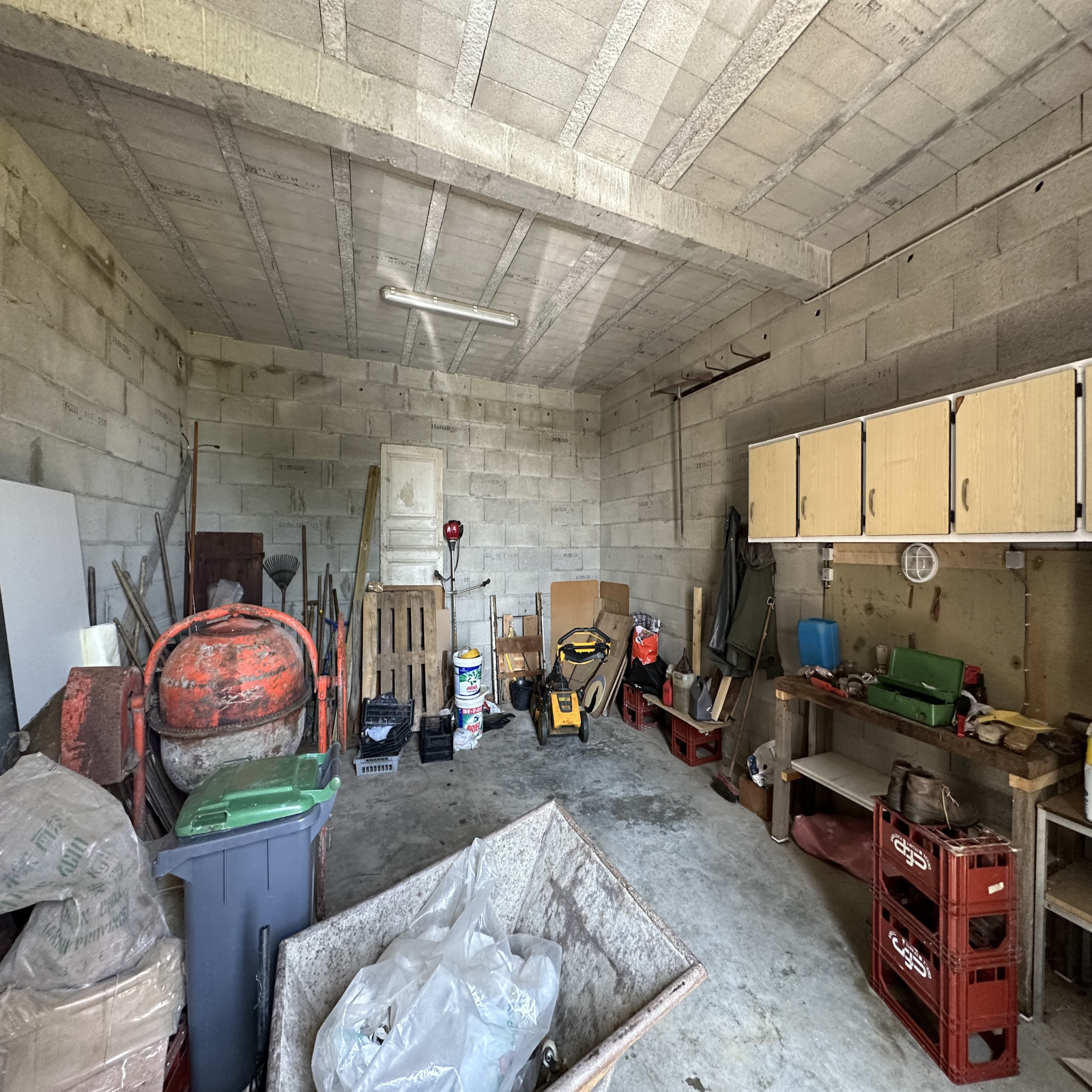 - Un grand garage (env. 34,5 m² – hauteur de 3,26 m), accessible directement depuis l’extérieur