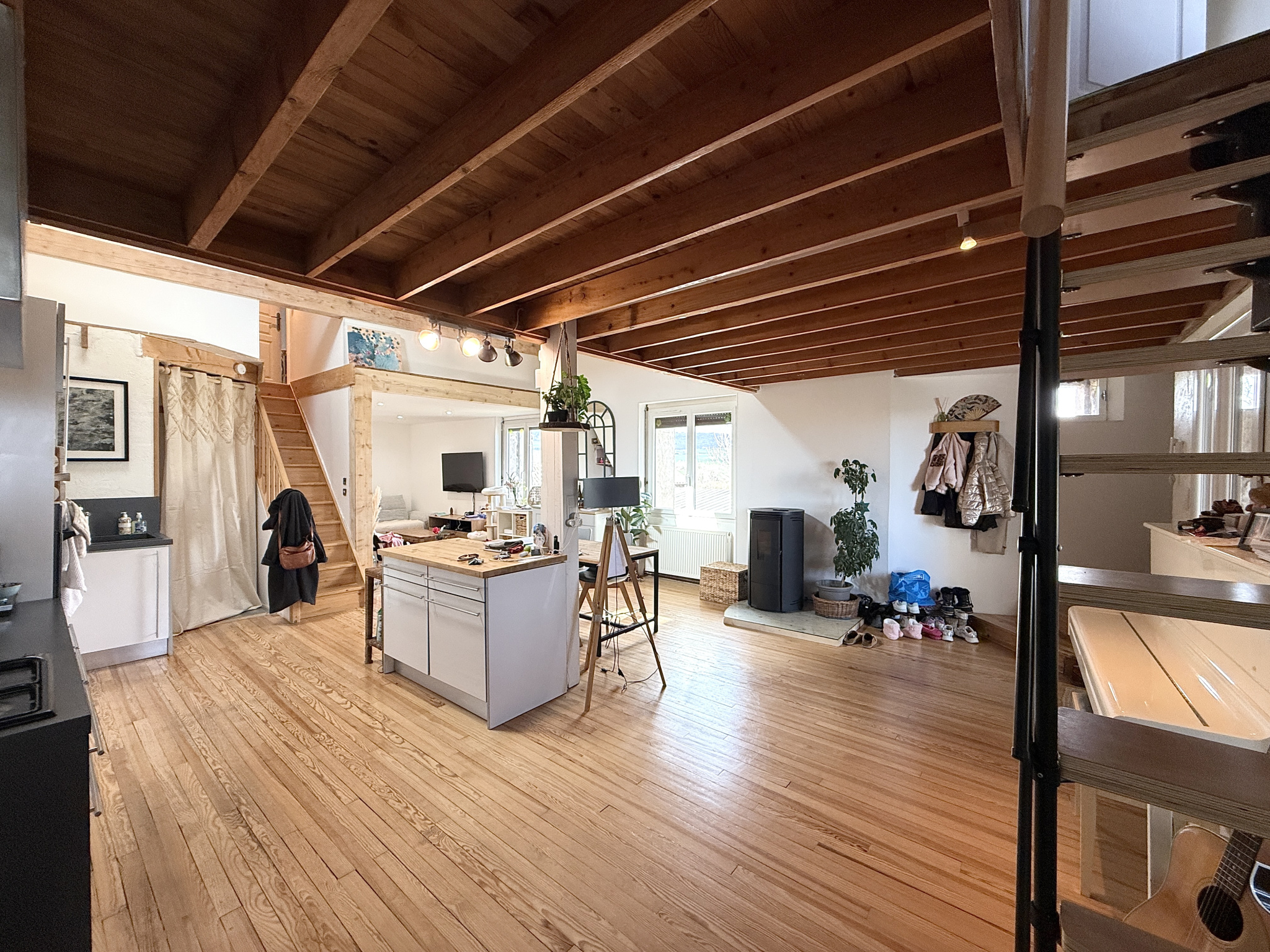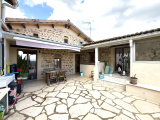 Le volume habitable, élevé sur dépendances, dispose au premier étage d'une vaste et lumineuse pièce de vie ouverte sur cuisine, ornée d'un plafond cathédrale et disposant d'une poêle à granulé, ainsi qu'un accès direct sur une belle terrasse exposée plein Est d'environ 35 m2 donnant accès à une véranda d'environ 8 m2.