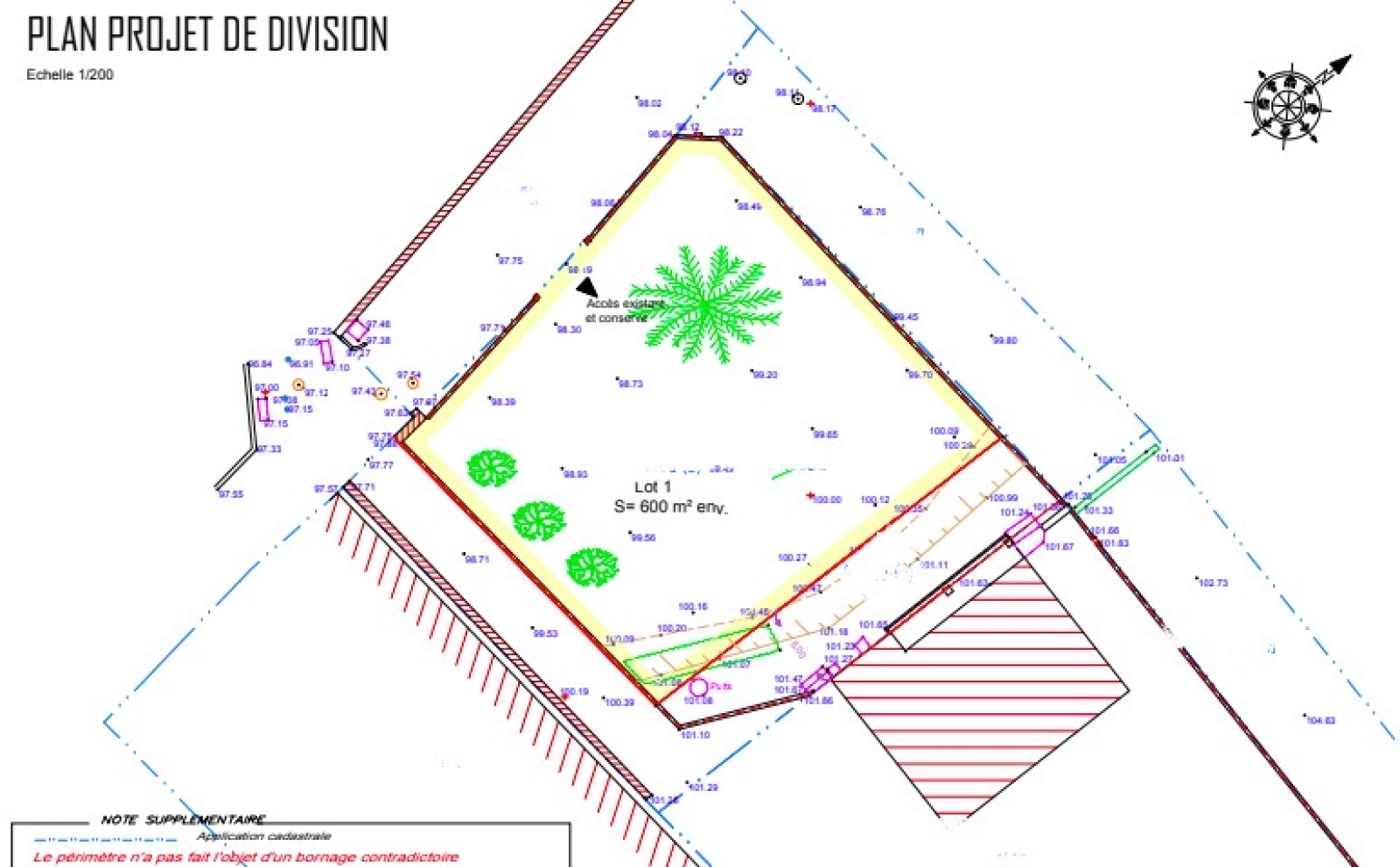 Environ 600m2. Bornes à poser pour découpe maison et chemin d'accès.