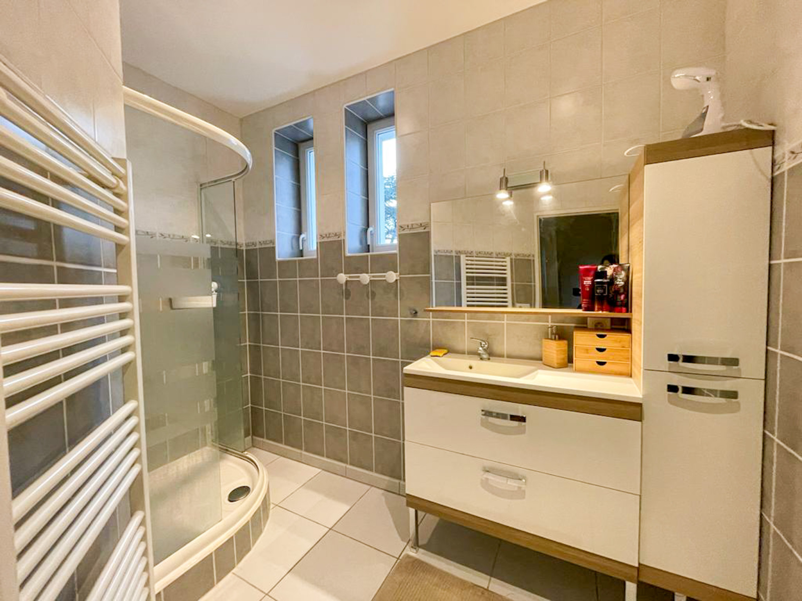 Cette maison T4 d’environ 90 m2 au sol soit 88,76 loi carrez, comprend au rez-de-chaussée une buanderie et une spacieuse chambre de 13,19 m2. Au premier étage, une entrée, une cuisine ouverte (évier/hotte/meubles) sur salon-séjour de plus de 31 m2, un hall et un WC séparé suspendu. Au dernier niveau, deux chambres équipées de placards avec miroirs de 13,1 et 9,97 m2, un WC suspendu, une salle d’eau (VMC, douche, une vasque, SC).