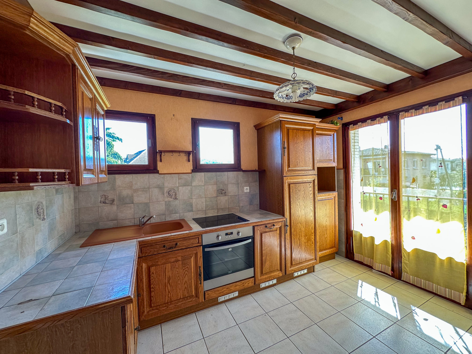 Menuiseries : simple vitrage bois d’origine, véranda en double vitrage alu, volets persiennes bois-acier.
