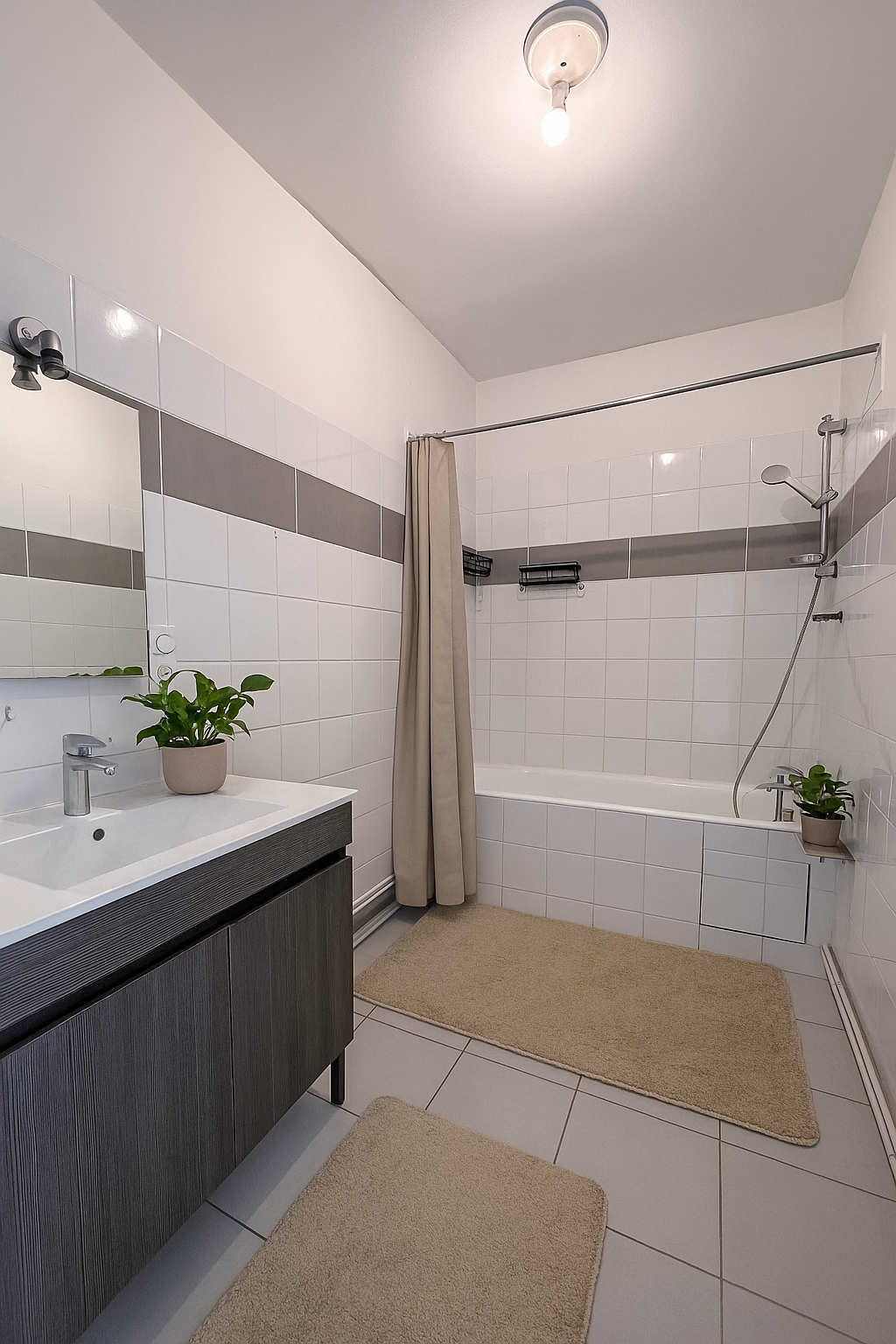 Il se compose d’une entrée, d’une cuisine neuve, équipée et séparée de 14,38 m² (avec VMC), d’un salon/séjour de 34,24 m² doté d’un placard, d’un WC indépendant de 2,81 m² (accueillant le cumulus et une chaudière électrique), d’une salle de bain de 4,87 m², ainsi que d’une chambre de 14,99 m².