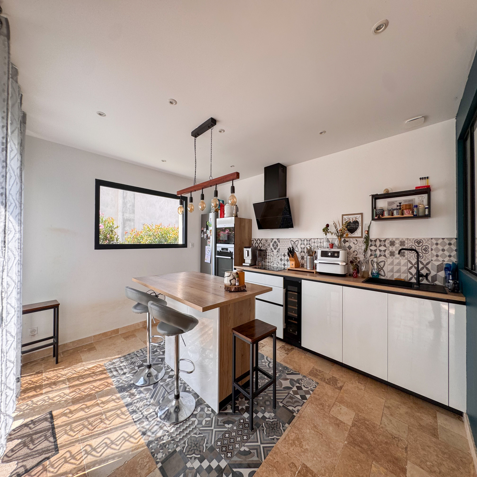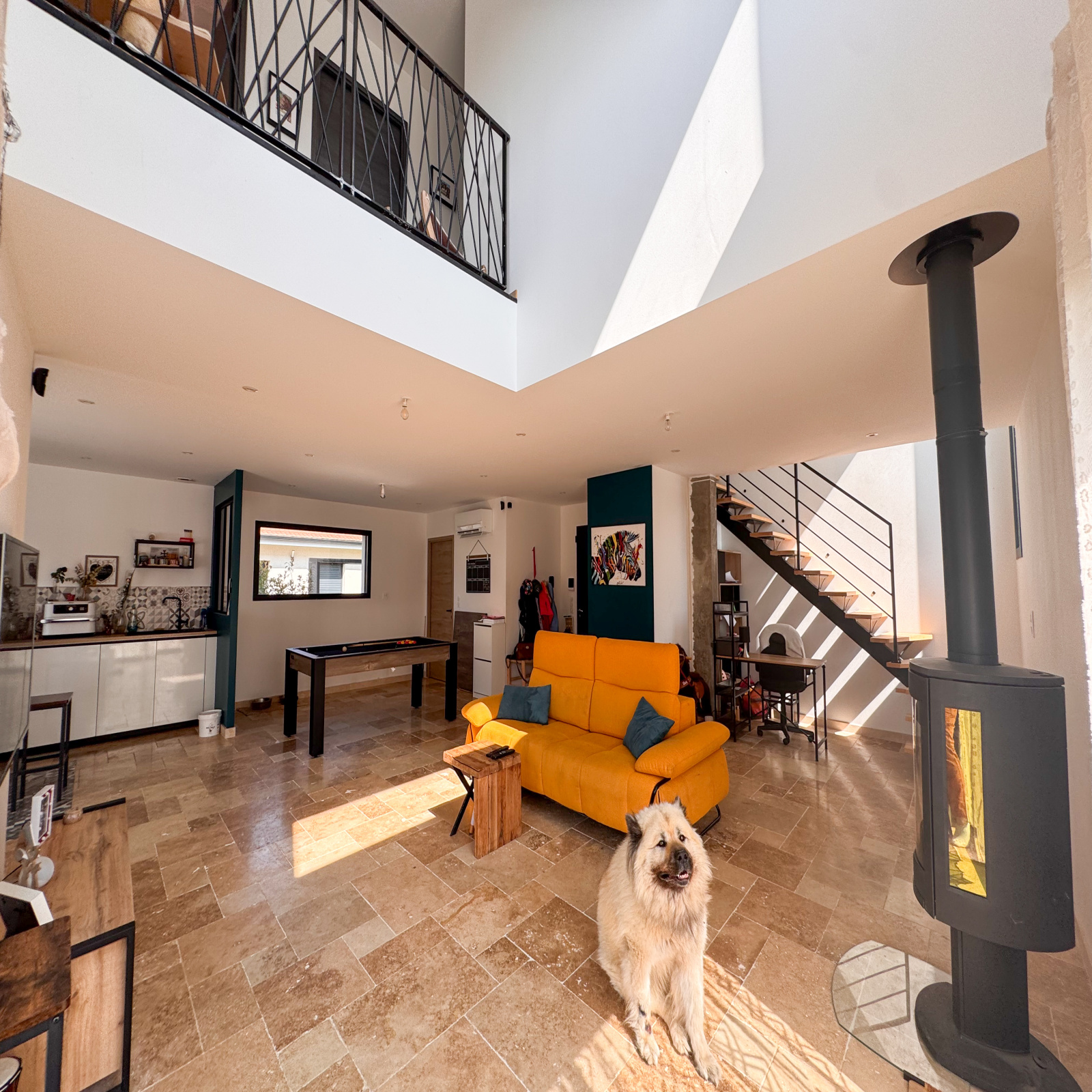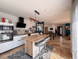Une vaste pièce de vie traversante avec cuisine meublée semi-équipée ouverte sur le séjour et, dans la continuité, un sublime salon avec une belle hauteur sous plafond, agrémenté d’un poêle à bois pour une atmosphère chaleureuse