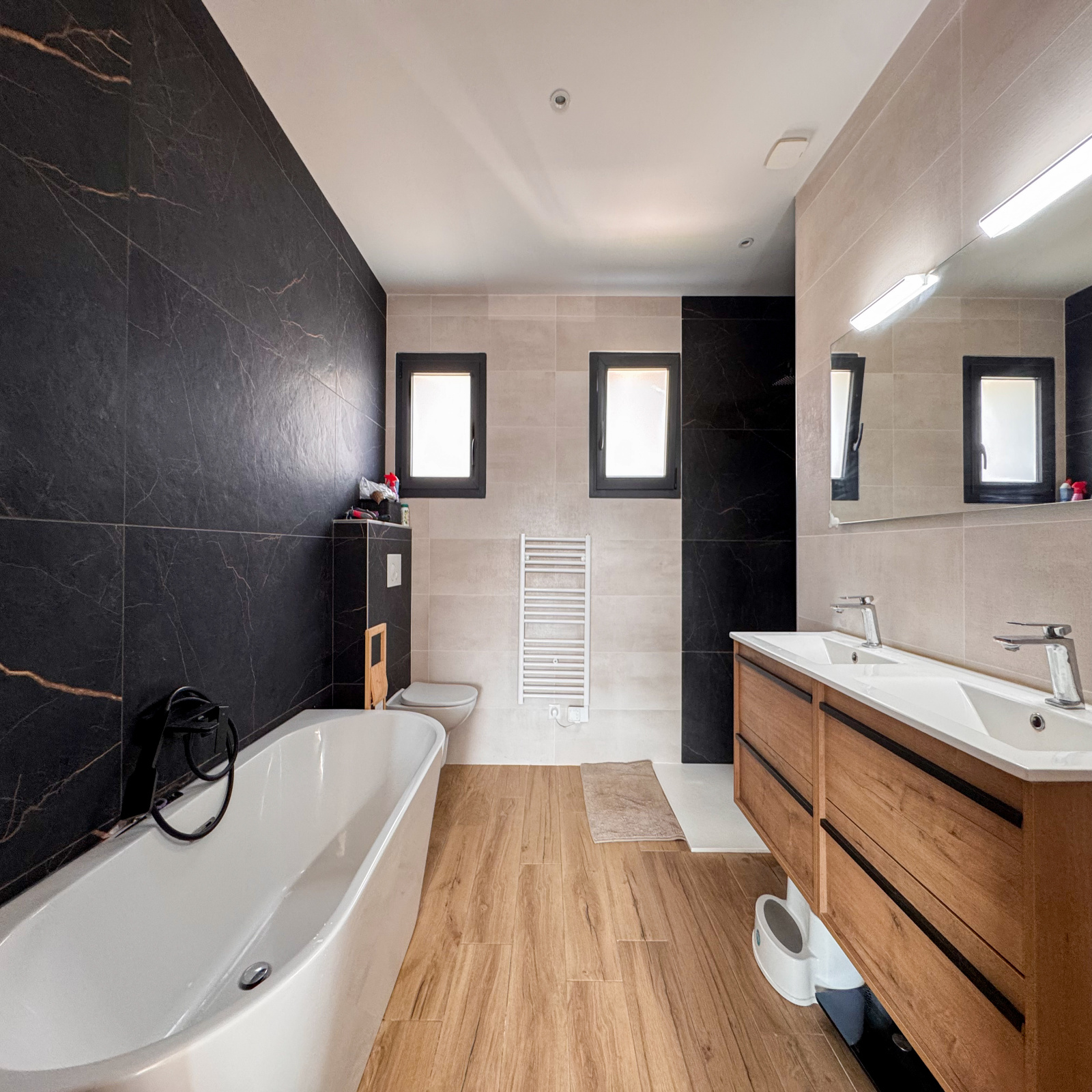 Une spacieuse salle de bains familiale avec baignoire, douche à l’italienne, double vasque, sèche-serviettes et WC