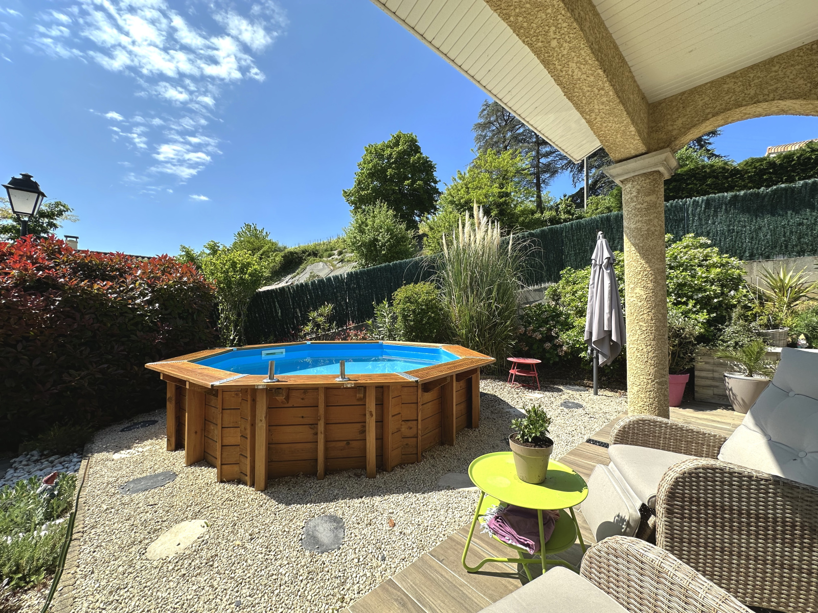 À l’extérieur, place à la détente. Les vastes terrasses, totalisant près de 65m², accueillent repas en plein air et moments de convivialité. L’été venu, la piscine en bois semi-enterrée devient un lieu de plaisir pour toute la famille. Le terrain, intime et bien entretenu, offre un cadre paisible à deux pas des commodités.