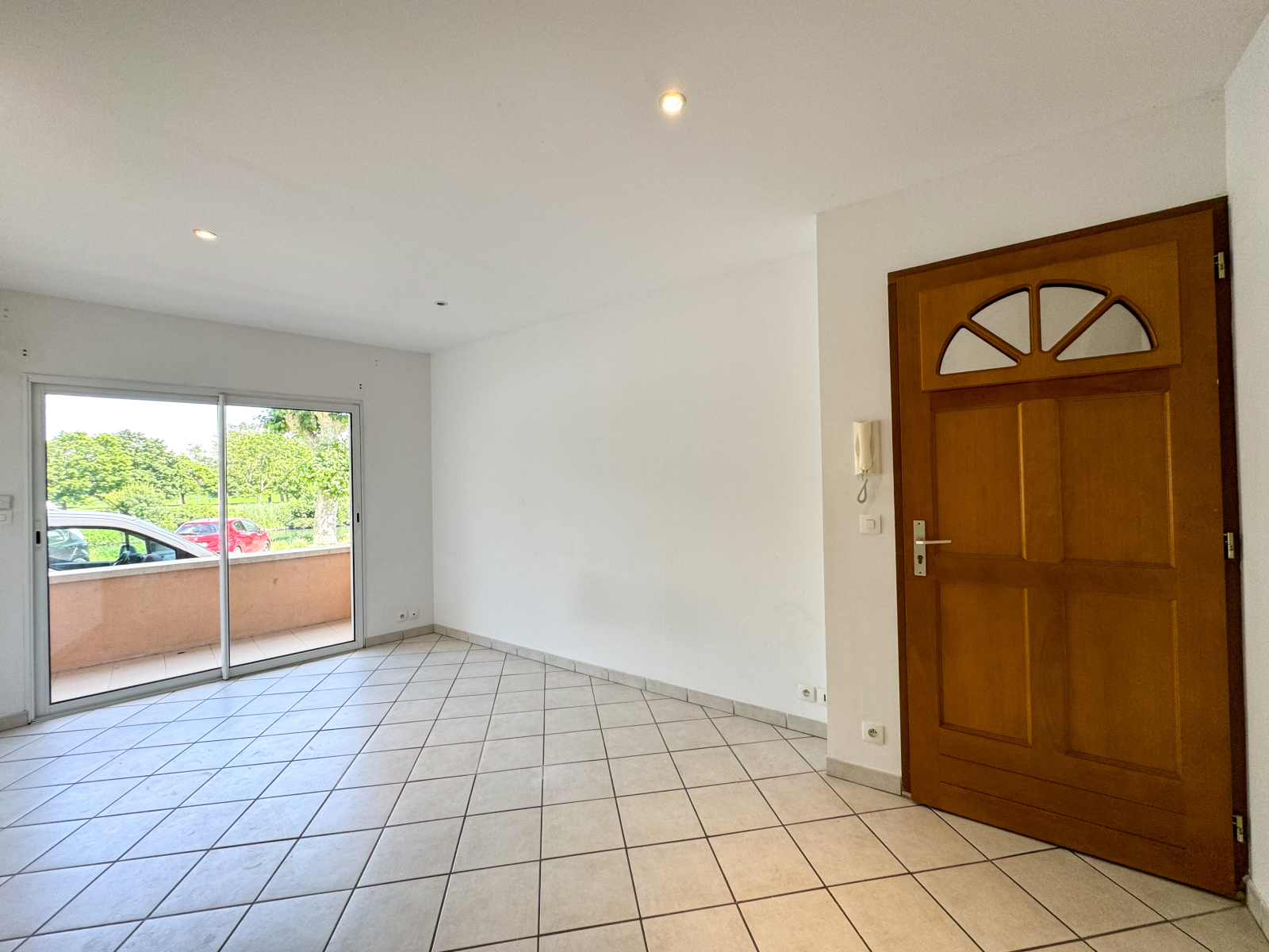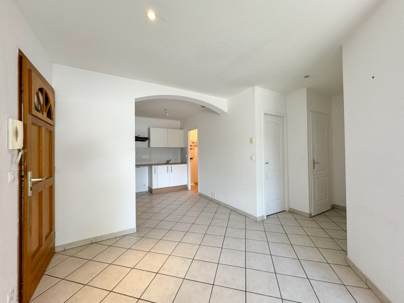 Le rez-de-chaussée s’ouvre sur un hall commun de 15 m² qui dessert un premier appartement T2 d’environ 40,7 m² composé d’une pièce à vivre avec accès au balcon, un cellier en arrière cuisine, une chambre avec rangements, une salle d’eau, et un WC séparé.