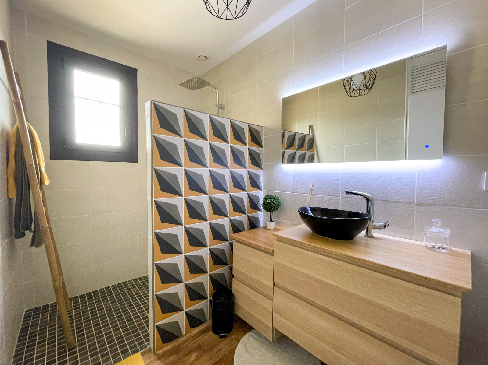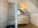 Au rez-de-chaussée, également accessible via une entrée indépendante, un superbe studio en duplex de 39,6 m2, comprenant une pièce à vivre avec espace cuisine, une spacieuse chambre et une salle d'eau avec WC.
