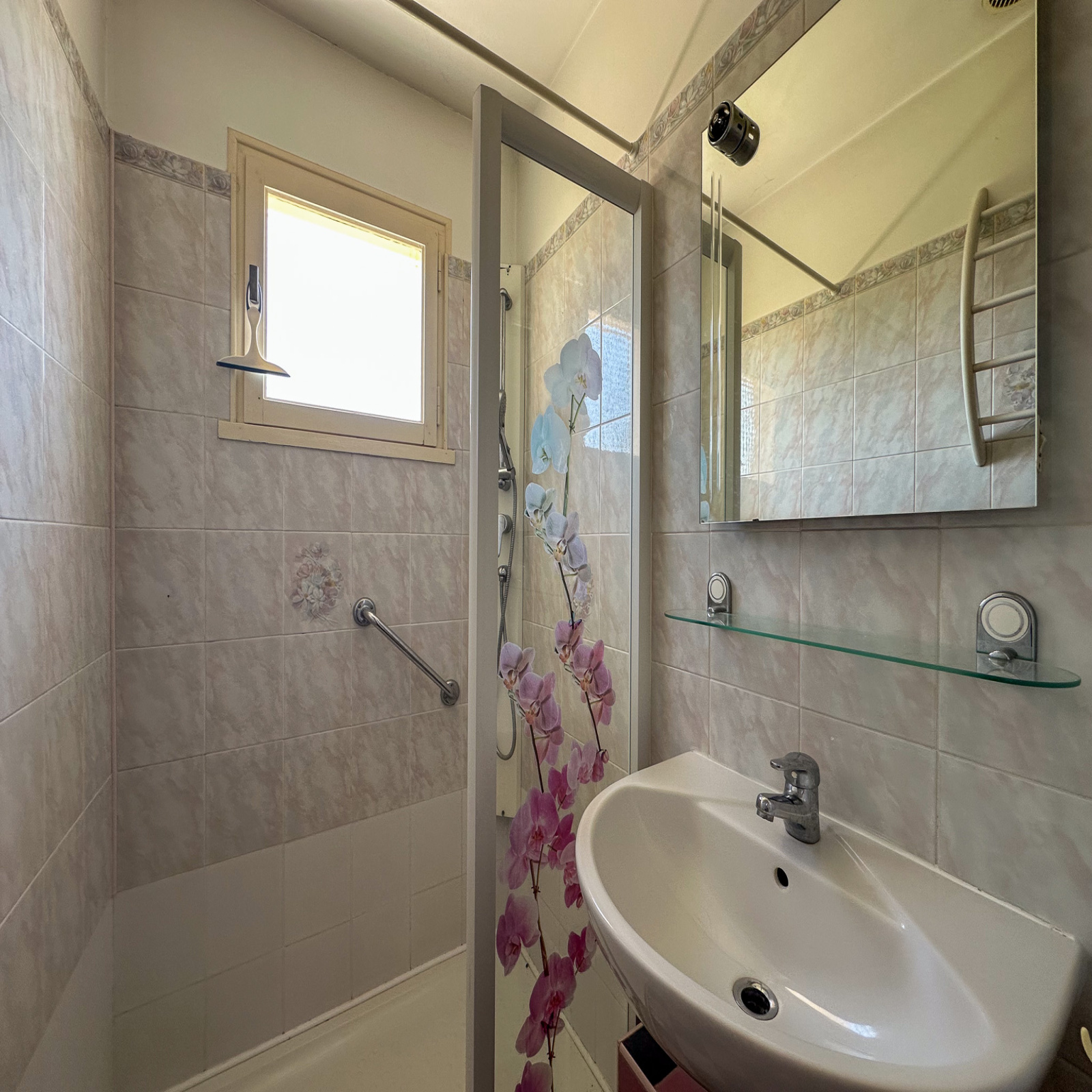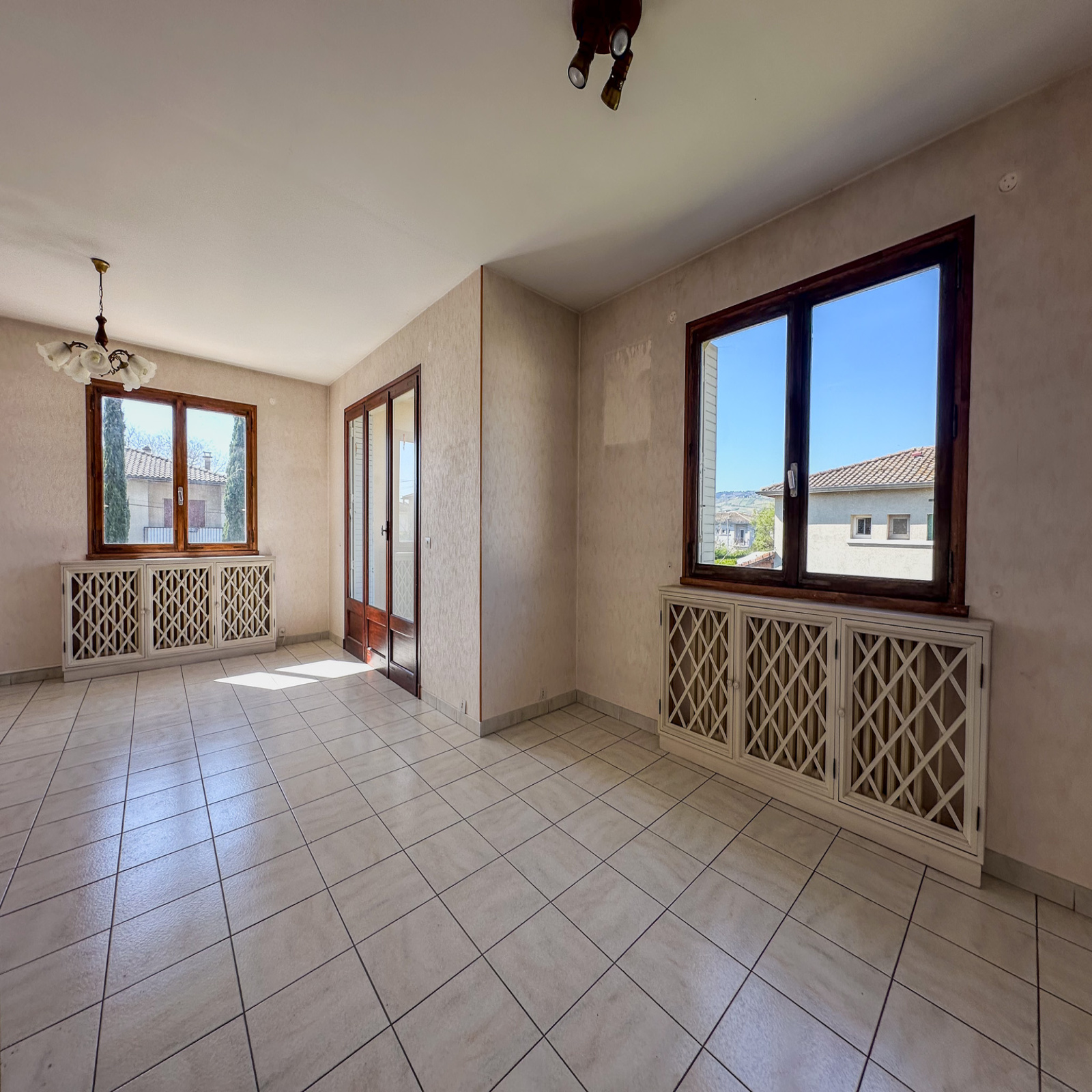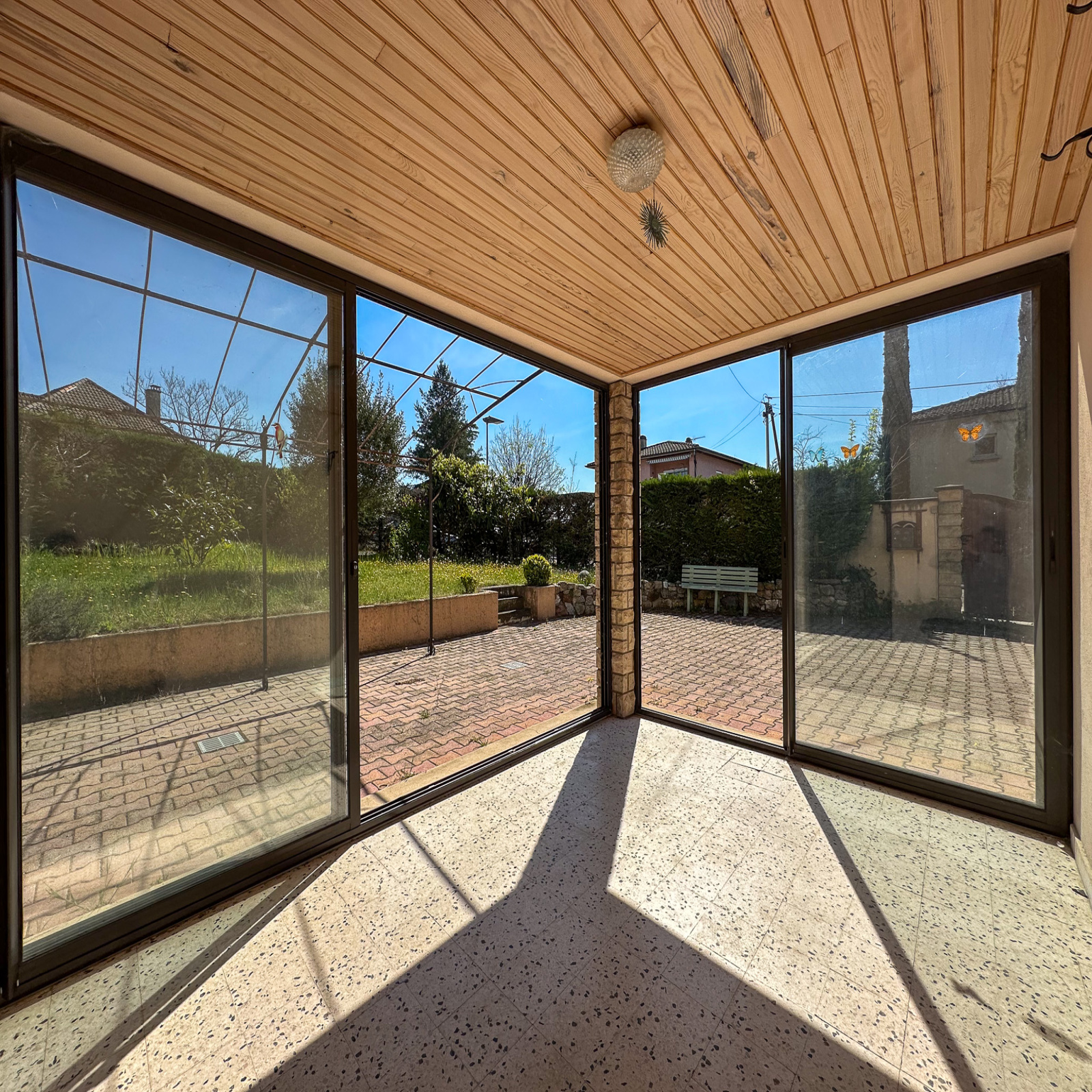 Menuiseries : simple vitrage bois d’origine, véranda en double vitrage alu, volets persiennes bois-acier.