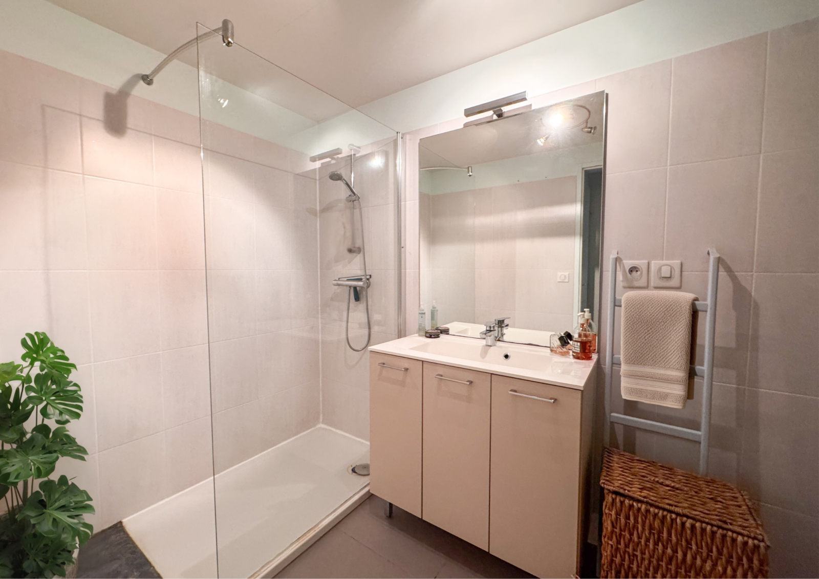 Un premier espace nuit comprend une chambre de 11 m², un bureau, une salle d’eau contemporaine et un toilette séparé.