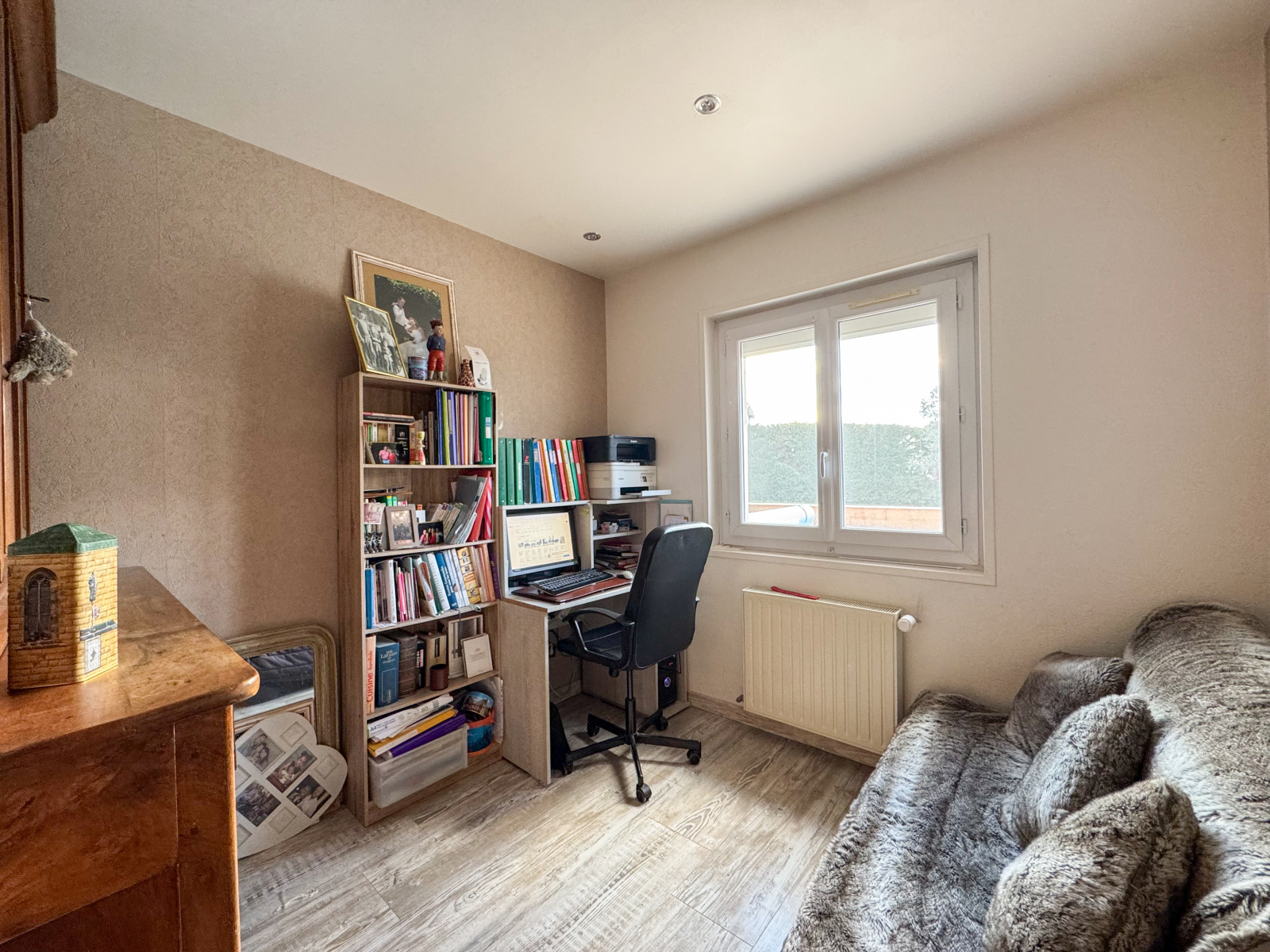 Au rez-de-chaussée, vous trouverez une cuisine ouverte sur un salon-séjour lumineux équipé d’un poêle à bois, un cellier/buanderie pratique, des toilettes séparées avec lave-mains, une salle de bains moderne (baignoire balnéo, douche, sèche-serviettes) ainsi qu’une chambre avec placard et un bureau (8 m²) faisant aisément office de chambre.