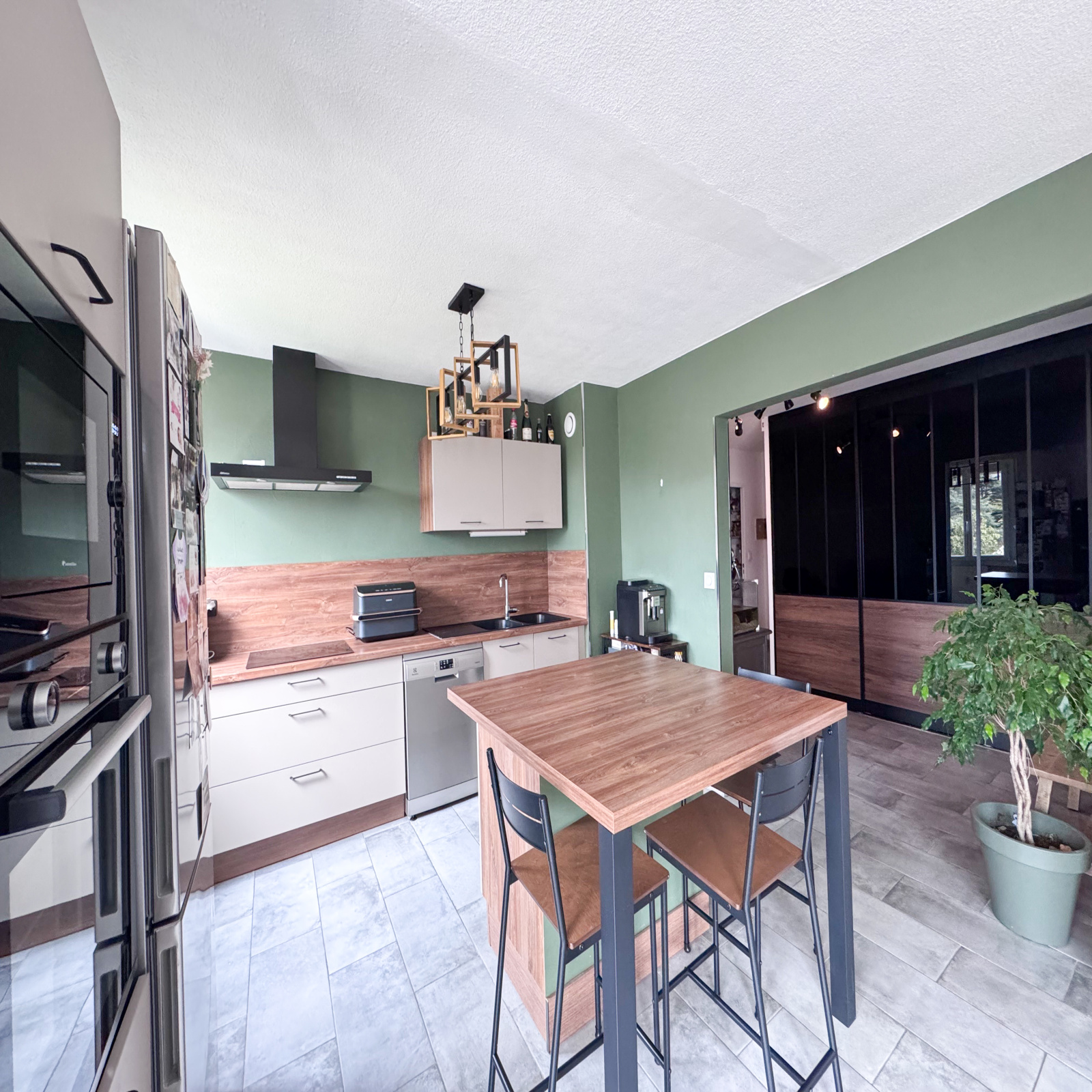 Une cuisine meublée et équipée Cuisinella, ouverte sur la pièce de vie (hotte à filtration, four, micro-ondes, plaque induction, îlot central, arrivée gaz sous évier, VMC)