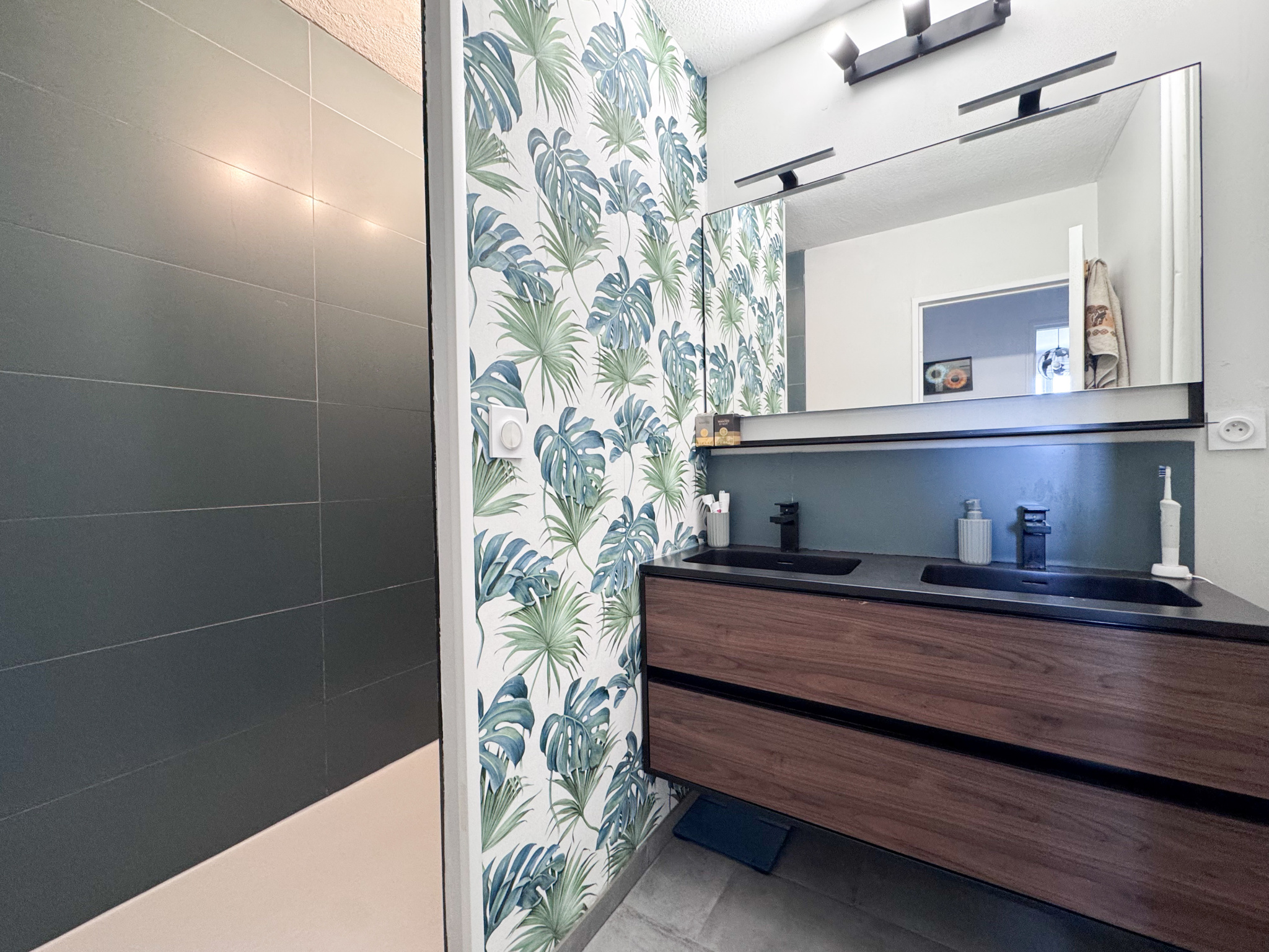 Une salle d’eau avec douche, double vasques, VMC et radiateur