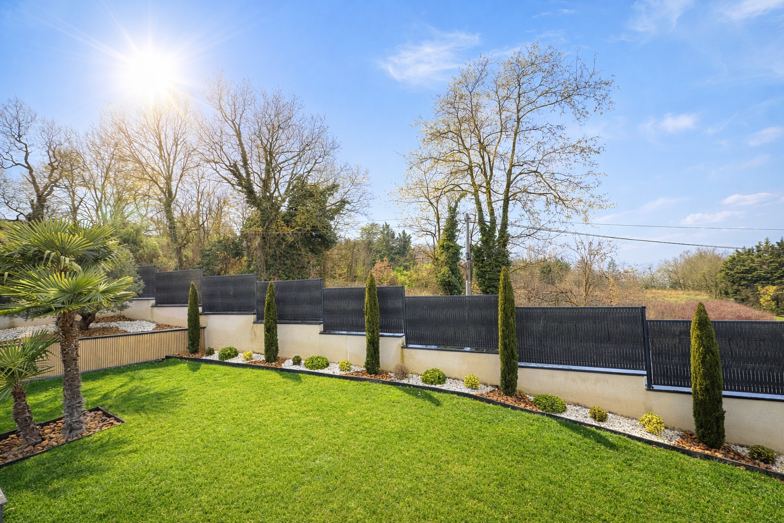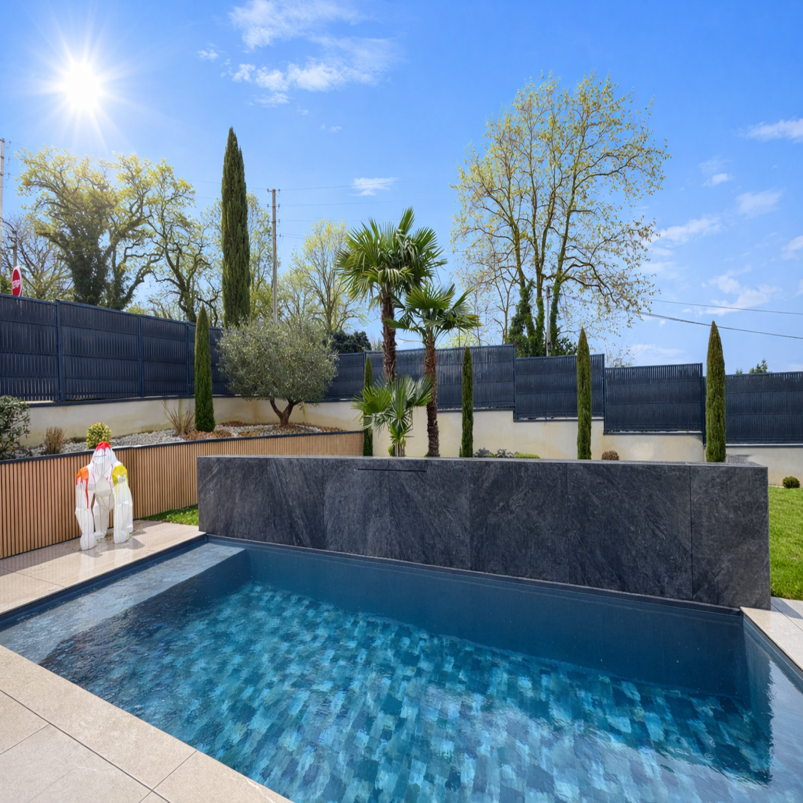 Aménagements extérieurs soignés : terrasse, pergola bioclimatique, piscine