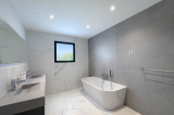 une salle de bains de 10,12 m² avec douche, double vasque, fenêtre, VMC et murs chauffants,