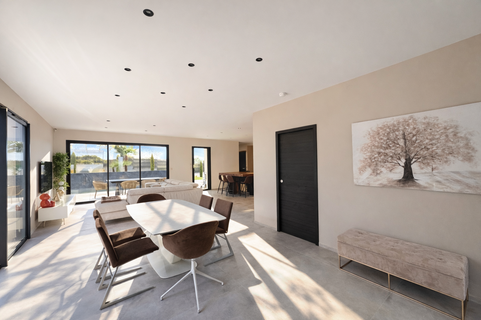 La cuisine contemporaine de 13,20 m², entièrement équipée (plaque de cuisson, hotte intégrée, four, micro-ondes, réfrigérateur, lave-vaisselle, machine à café, lave-mains, VMC), s’ouvre sur un vaste salon-séjour lumineux de 48,90 m², offrant un espace de vie convivial et agréable.
