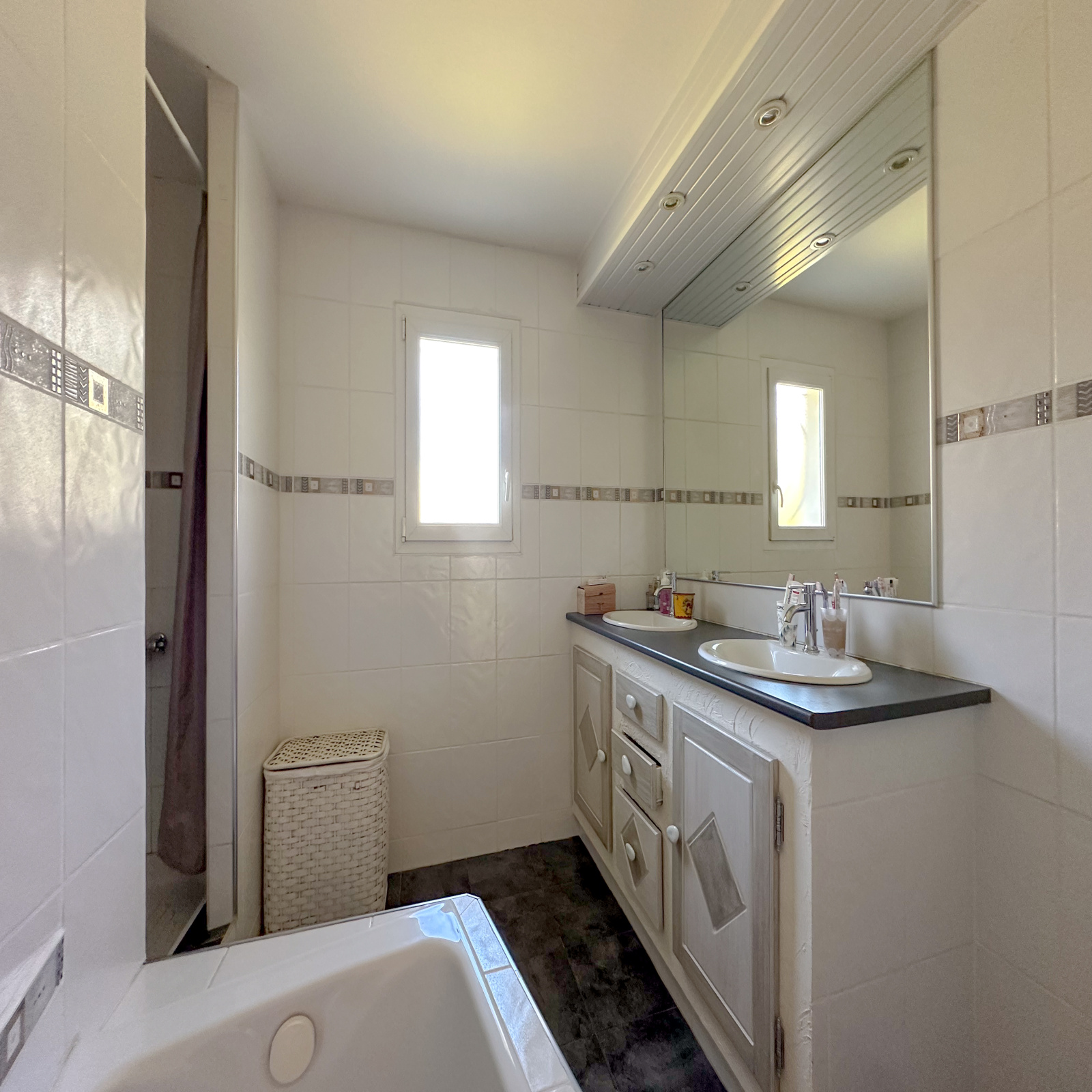 Un couloir dessert les pièces de nuit : quatre belles chambres avec placards intégrés, chacune offrant confort et intimité. La salle de bains, à la fois fonctionnelle et élégante, dispose d’une baignoire, d’une douche, de doubles vasques et de nombreux rangements. Une buanderie attenante vient compléter ce bien avec une grande praticité au quotidien.