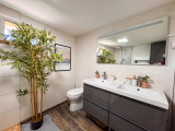 Salle d’eau moderne avec douche, double vasque, sèche-serviettes et fenêtre.
