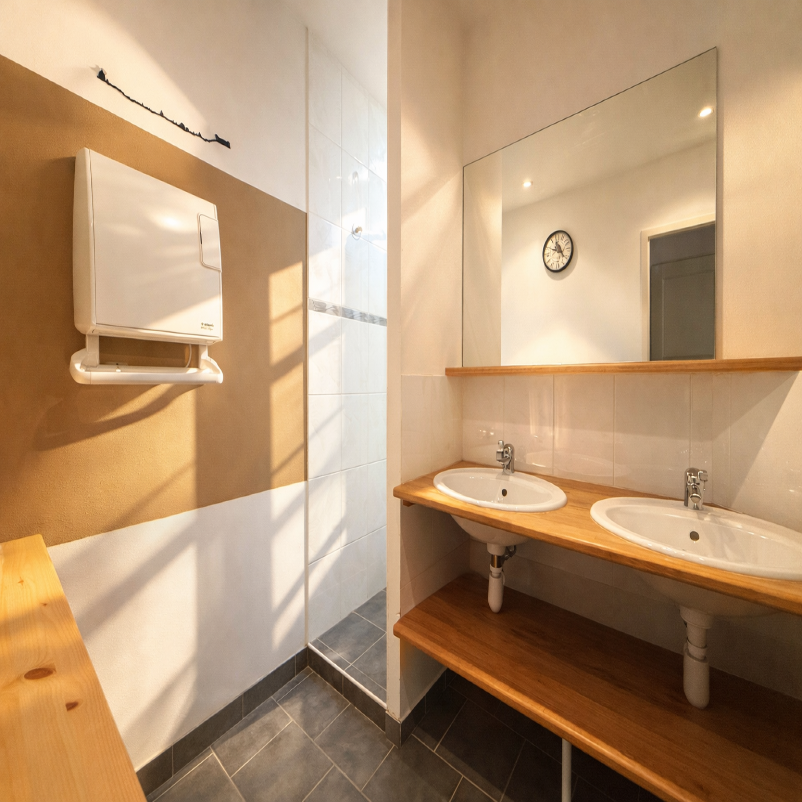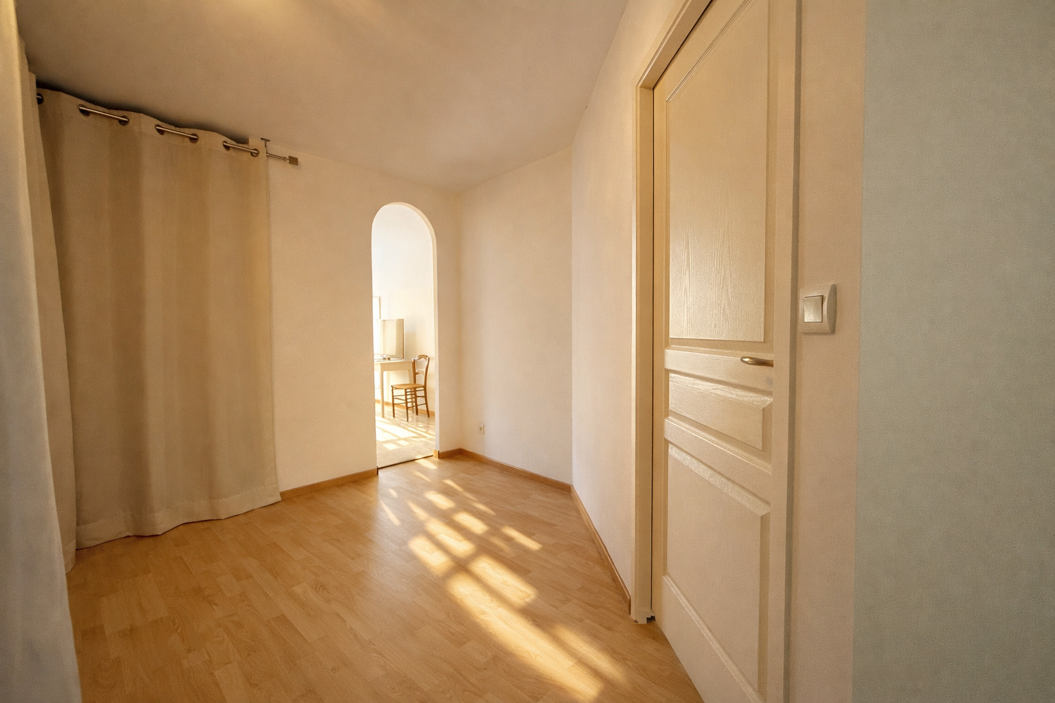 Au même niveau, un dégagement desservant une salle d'eau dotée d'une douche italienne, double vasque et sèche-serviettes, ainsi qu'un sanitaire indépendant.
