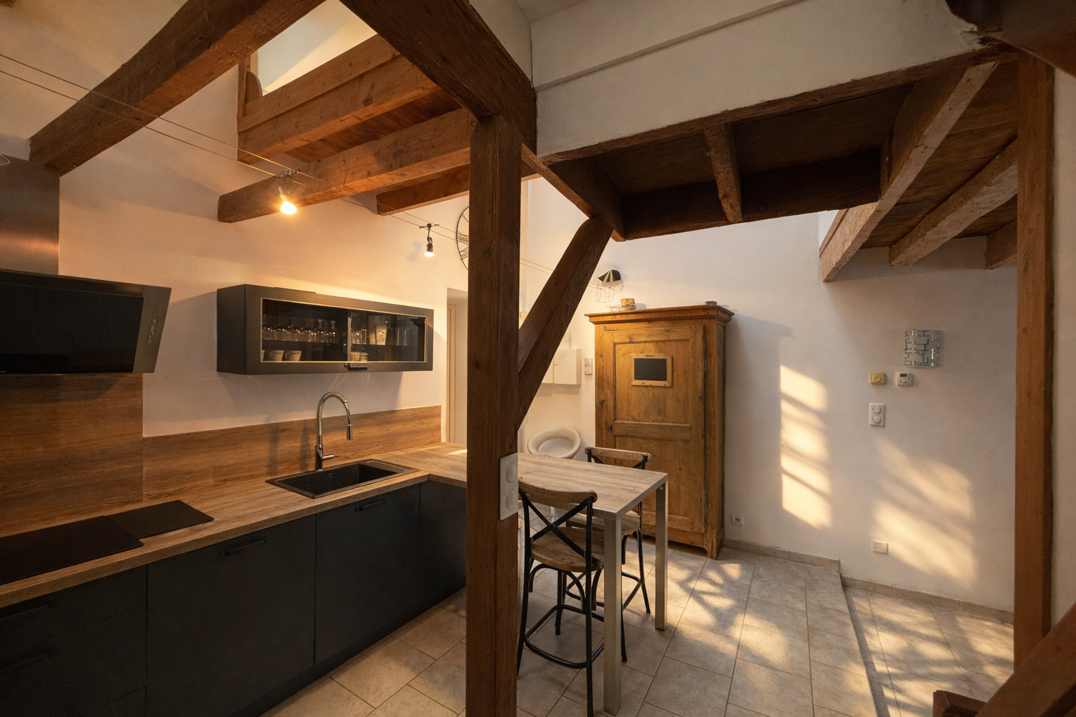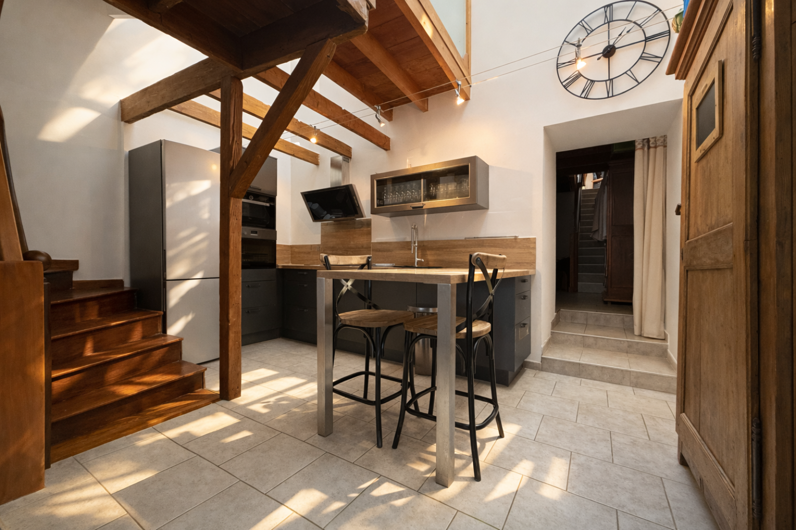 Le volume habitable vous accueille en Rez-De-Chaussée par une vaste pièce de vie ouverte sur une cuisine meublée et semi-équipée, ornée d'un plafonds cathédrale avec velux pour une luminosité optimale.